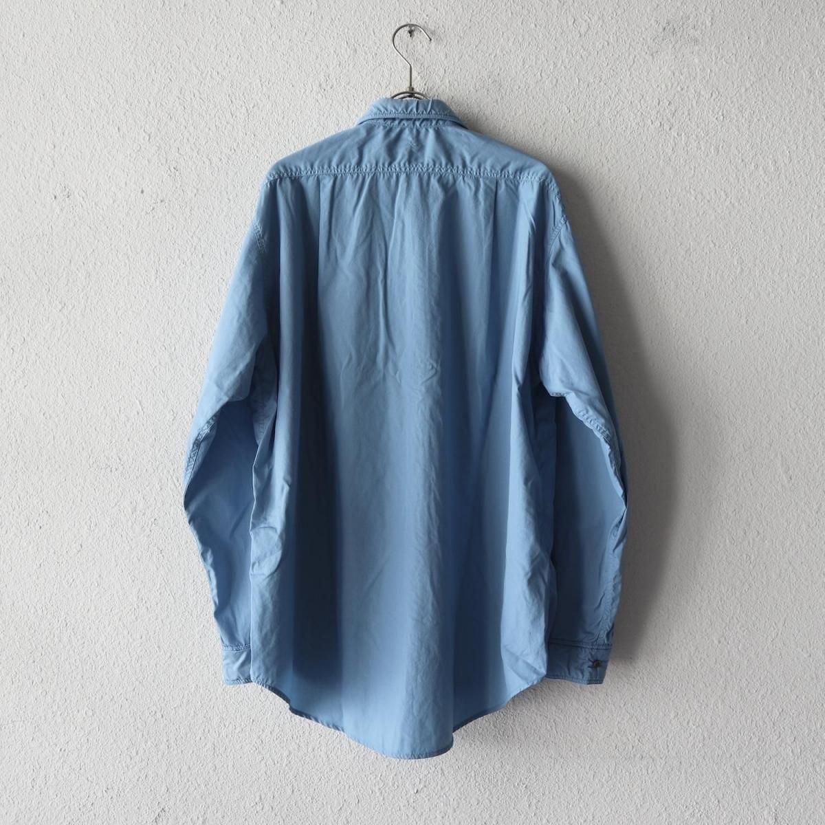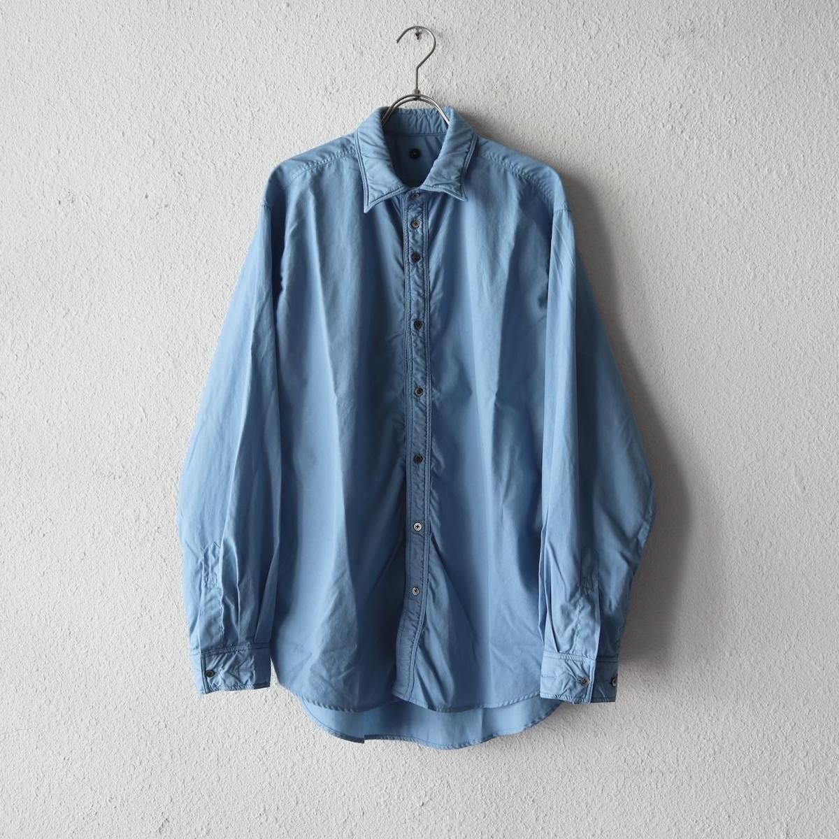 FACE : COTTON 100%ANOTHER FABRIC : WOOL 90% NYLON 10%MADE IN JAPAN製品染め加工M-65フィッシュテールパーカーのポケットの構造から着想し、芯地にウール生地を使用したコットン素材のシャツです。M-65フィッシュテールパーカーのポケットには袋布の部分にウールが使われています。長年の着用によりウール生地が縮み、ポケット口やフラップ周辺に影響が出ていることがあります。その様子を再現するために芯地にウール生地を使ったシャツを製作。芯地として使用したウール生地が製品加工途中で発生する熱処理により大きく縮み、表にシワを発生させたパッカリングのデザインが特徴です。製品染めのBLUEカラーも今シーズンお勧めです。size 2 : 前着丈73 後着丈79 肩幅47 身幅61 袖丈59cmsize 3 : 前着丈76.5 後着丈83 肩幅48 身幅63 袖丈61cmmodel : 173cm 60kg 着用サイズ2