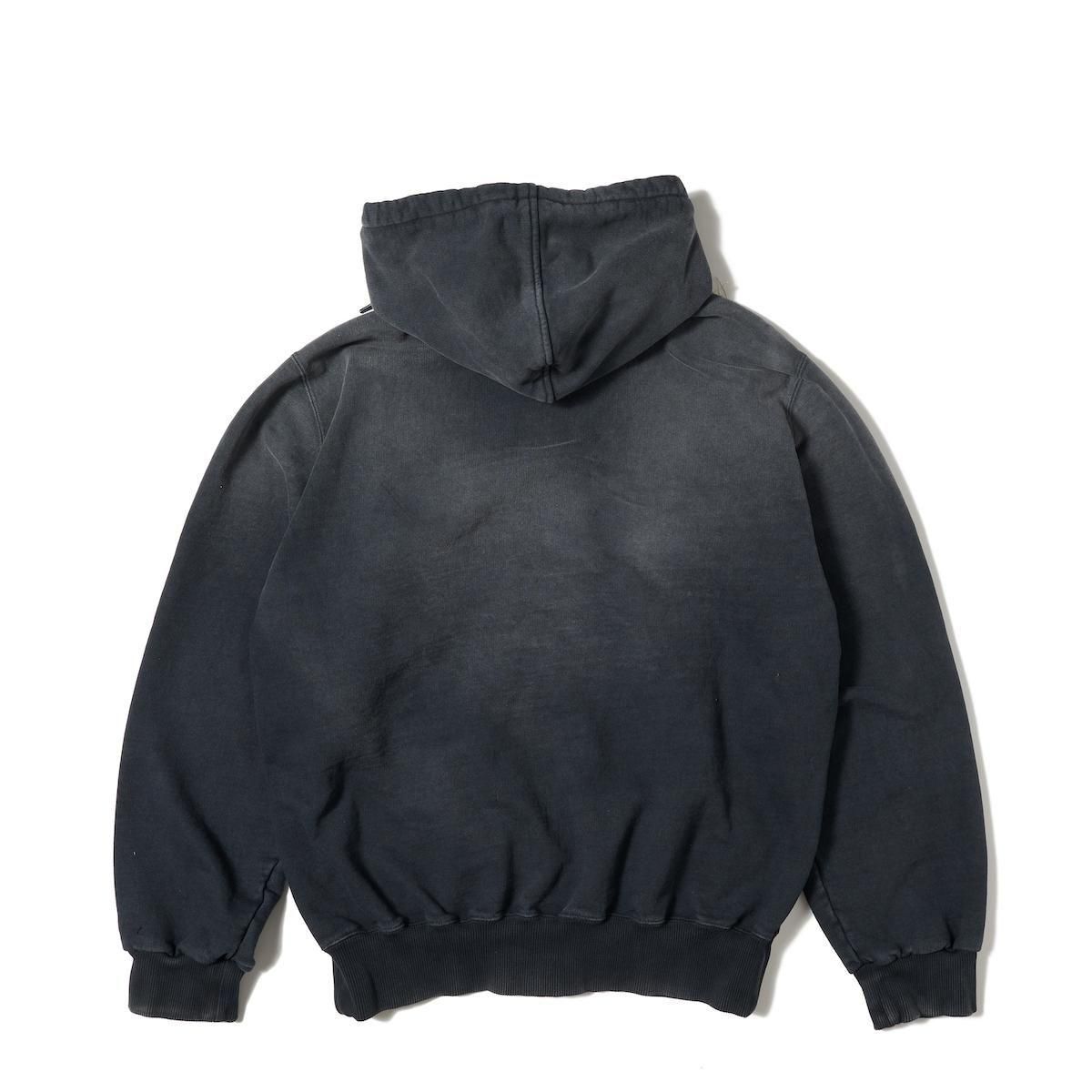 製品染めにより、ヴィンテージのような風合いが生まれ、刺繍の立体感と相まって迫力のある仕上がりになっています。リアルでなくとも、そこに宿る魅力は本物と変わらない。もしくはそれ以上。あなたはこのフーディーをフェイクだと思いますか?