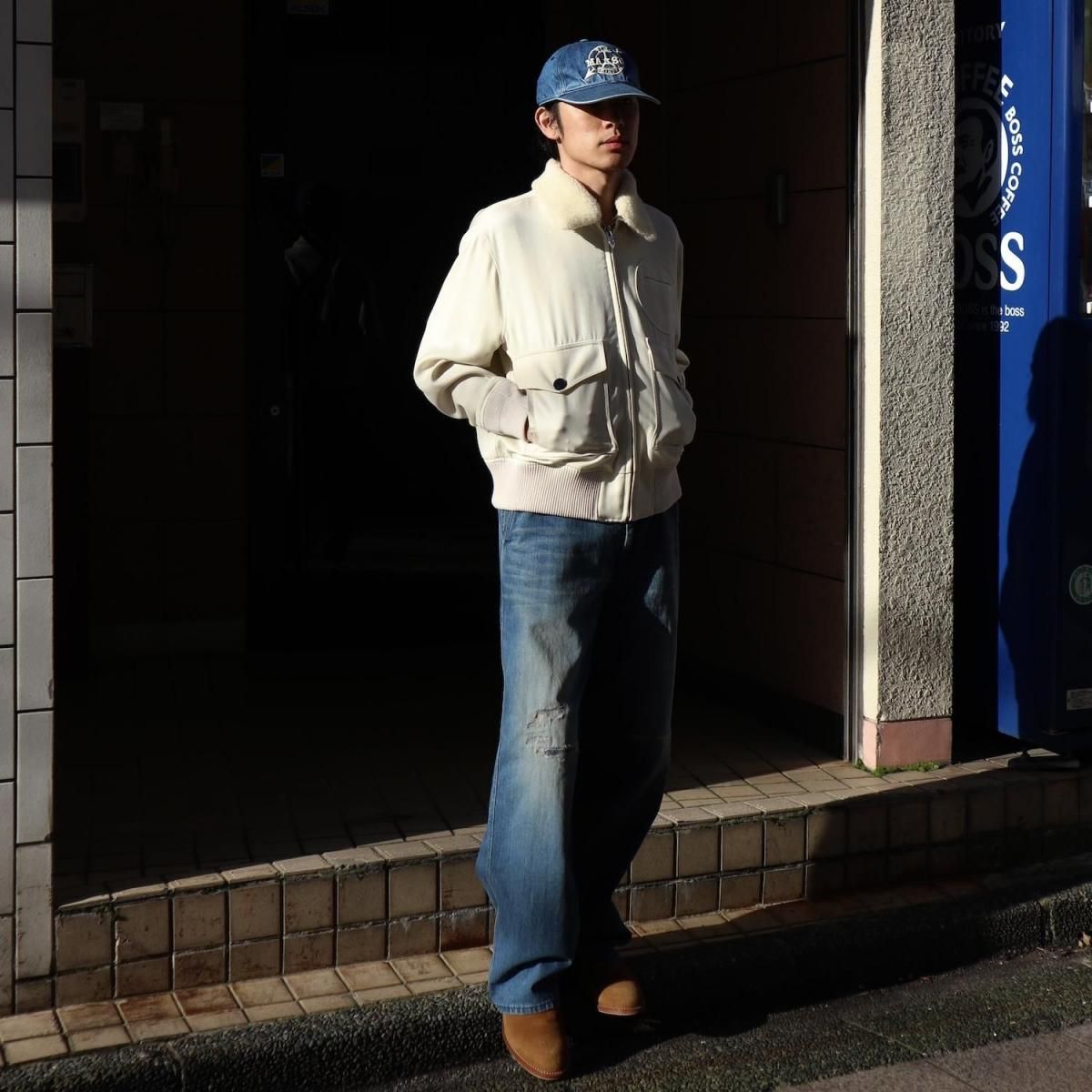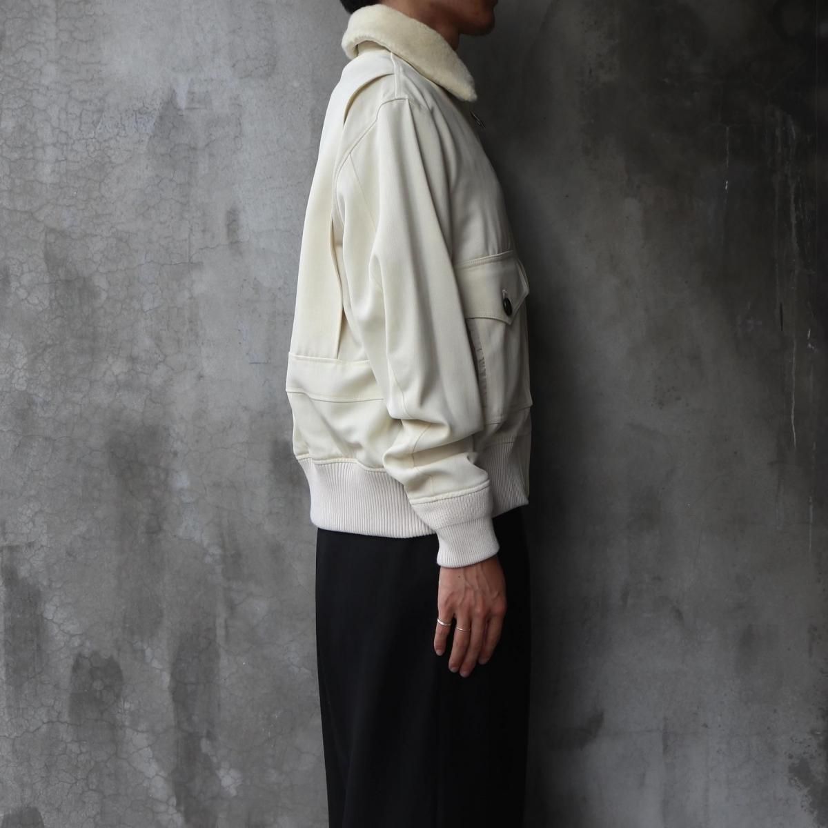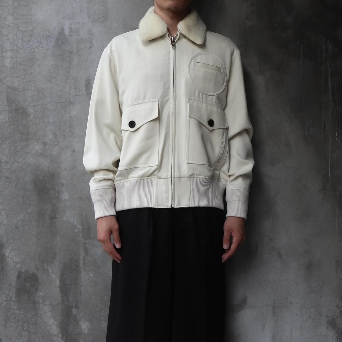 SHELL : WOOL 100%LINING : CUPRO 100%RIB : COTTON 46% POLYESTER 45% NYLON 8% POLYURETHANE 1%BOA PILE : WOOL 100%GROUND : POLYESTER 100%ボア付きのフライトジャケット。重みのある落ち感が特徴のウールカルゼを表地に使用。程よく身幅が広く、着丈は短めのボックスシルエット。2019FWコレクションで発表された、カクテルフライトジャケットをベースにデザイン。パイロットが任務を終え、そのままカクテルパーティに赴くことを想定し、ワッペン型のポケット、取り外し可能のボアの襟、クラシックな表地、タキシードのようなサテン地の部分使いなど、パーソナルなストーリーを描いたユニークな1着。size 46 : 着丈63 肩幅49 身幅56 袖丈63cmmodel : 173cm 60kg 着用サイズ46
