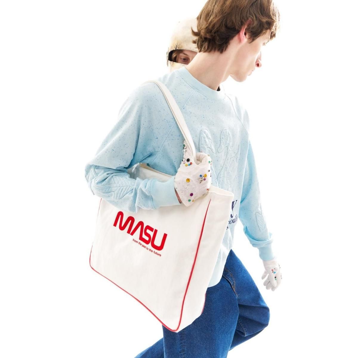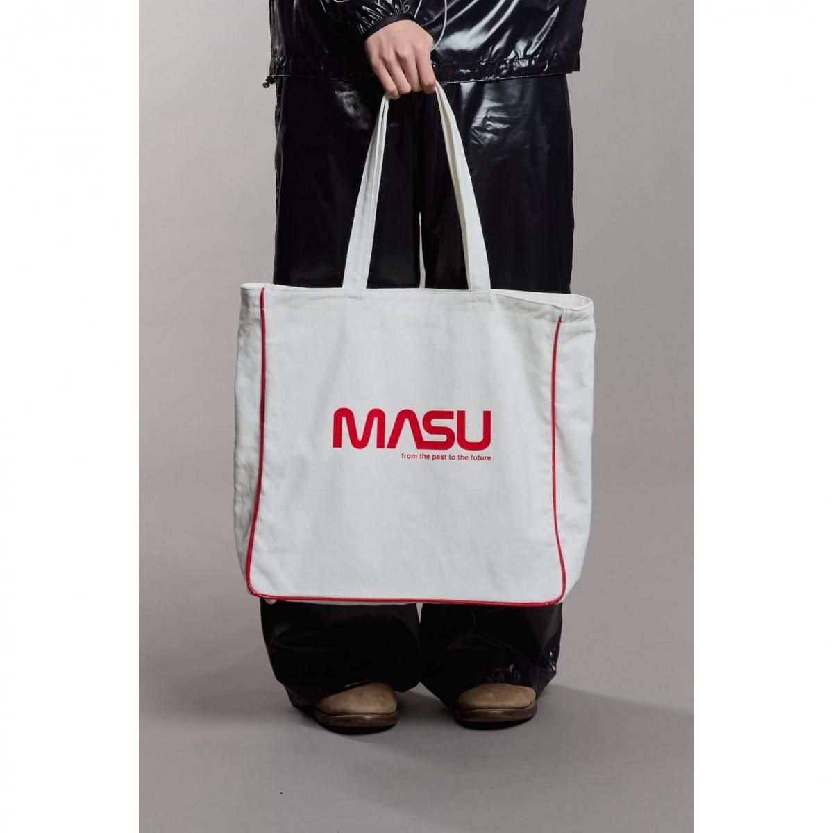COTTON 100%キャンバスのトートバッグ。程よく空気を含んだようなソフトなタッチのキャンバス地を使用。キャンバスに相反するように配された縫い目のエナメルのパイピングがアクセント。ロゴはフロッキープリントされており、立体的な表情が特徴的。1泊~2泊は宇宙旅行出来るほどの容量。
