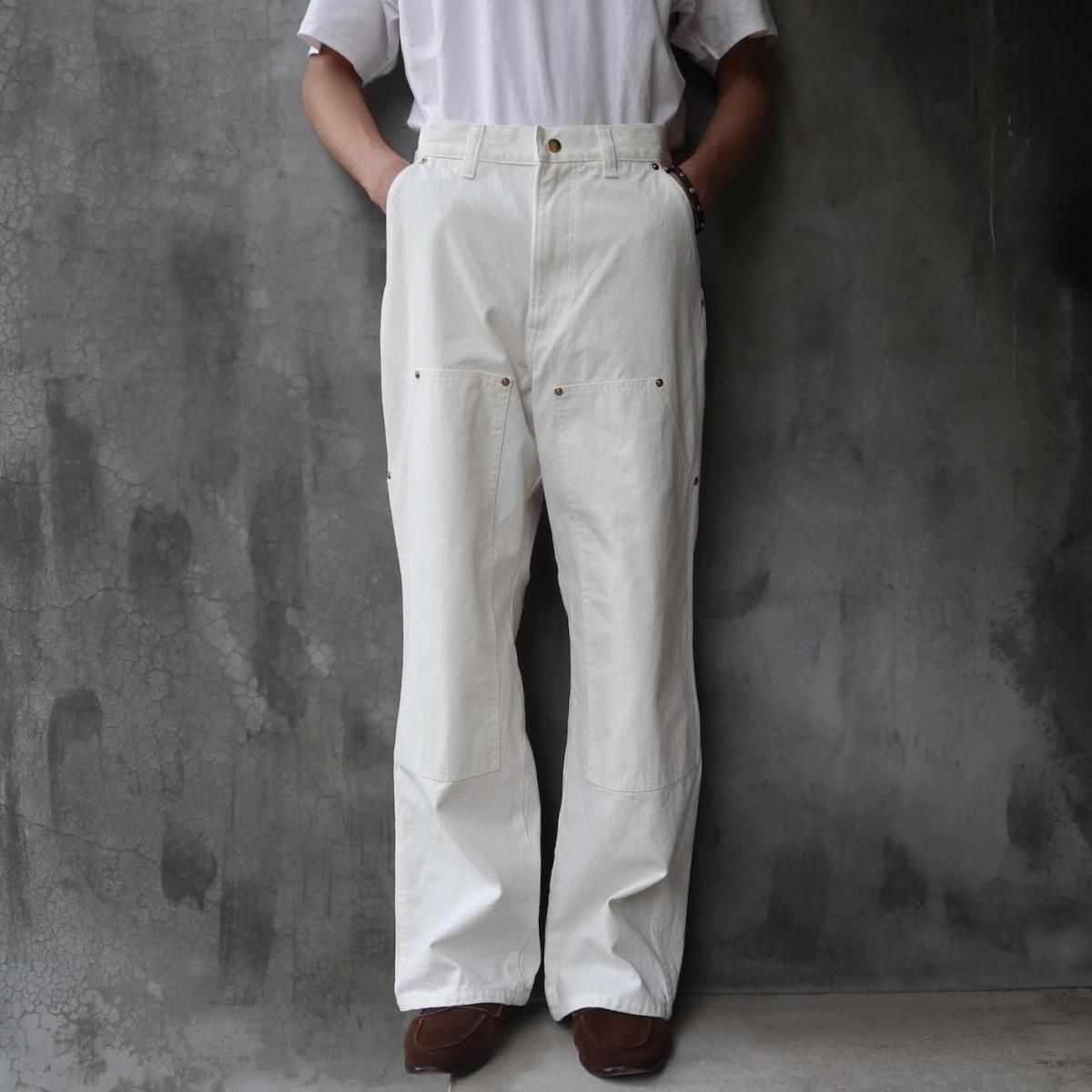 COTTON 100%TALON ZIPPERONE WASHコットン100%のセルヴィッチダック素材を使用したダブルニーダックパンツ。軽さのあるダック素材で着込むごとに柔らかく風合いが増していく素材です。ワークの文脈を再解釈し、バックポケットがデニムパンツにある形を採用したUNUSEDらしいありそうでない遊び心のあるデザインが特徴です。すっきりとしたストレートシルエットになります。(生地の特徴)表地(DUCK地):力織機を使用したセルヴィッチダックで、適度な打込みに加え膨らみある風合いを持ち合せた素材です。size 2 : W83 股上39 股下77 裾幅25cmmodel : 173cm 60kg 着用サイズ2