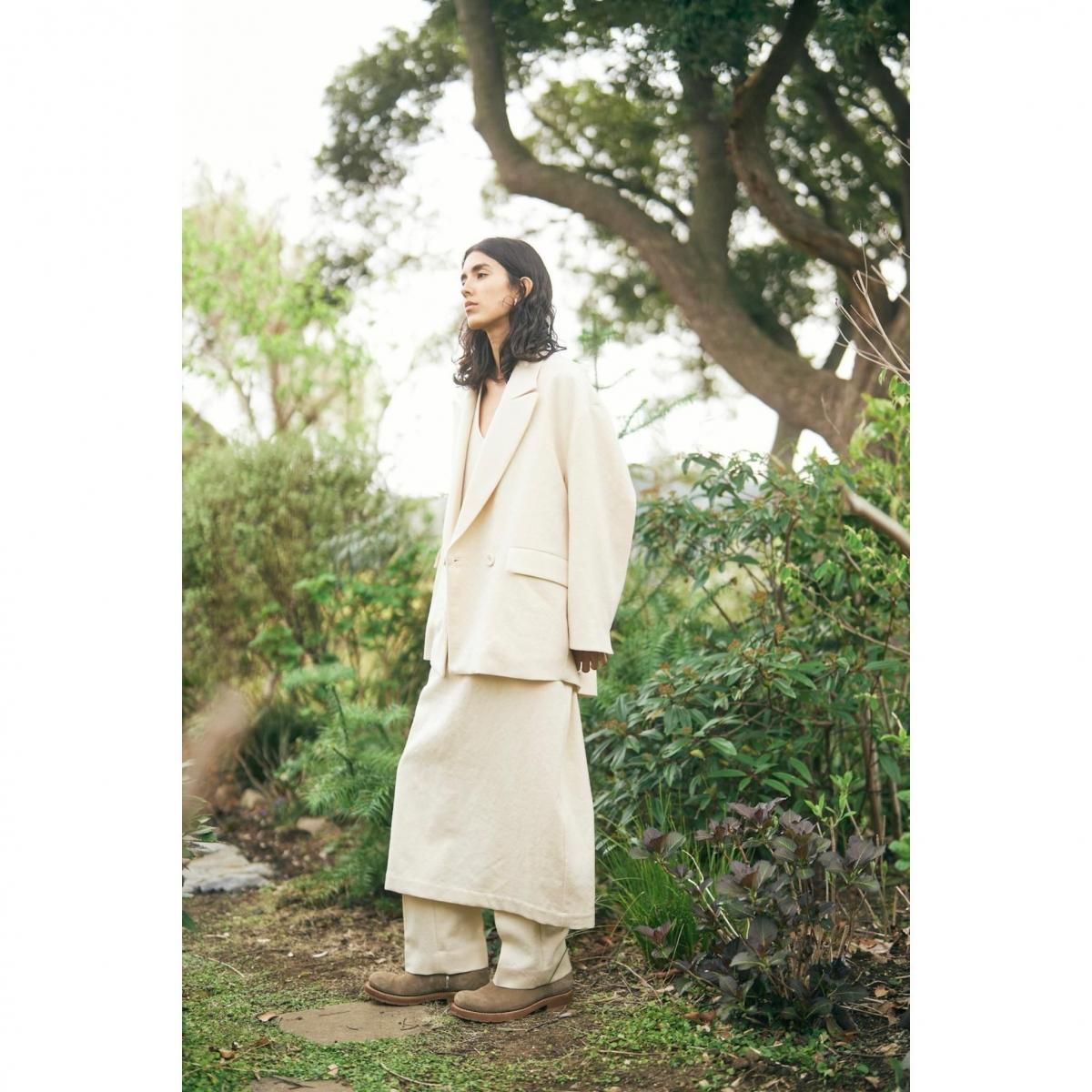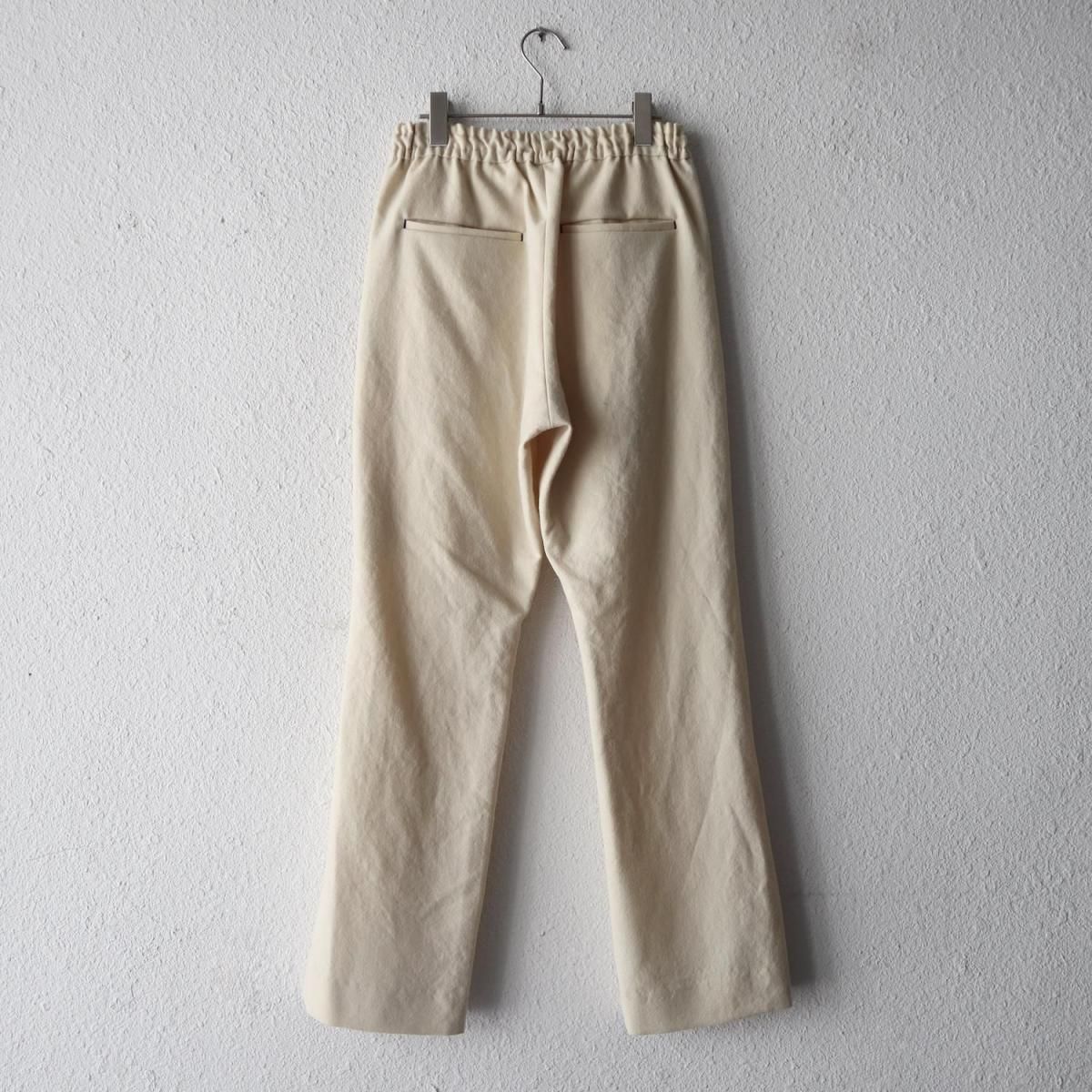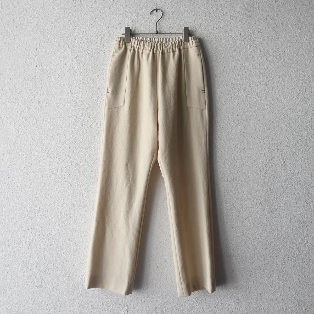 コシのあるしっかりとしたウールを、ドライな風合いのツイルに織り上げた素材を使用。仕上げにはウールでは珍しい近江晒(おうみざらし)を施し、独特のシワ感と柔らかさをプラス。ウエストはゴム仕様でリラックス感を保ちながら、クラシカルな美しいシルエットに。内側の紐でサイズ調整も可能。同素材のジャケットとのコーディネートもおすすめです。
