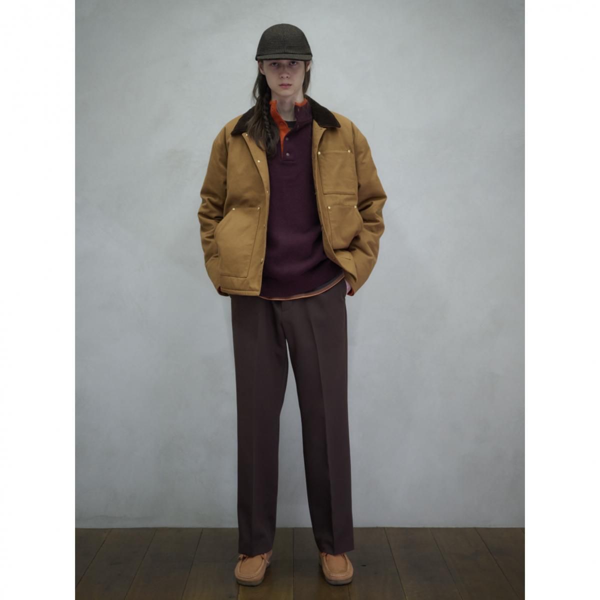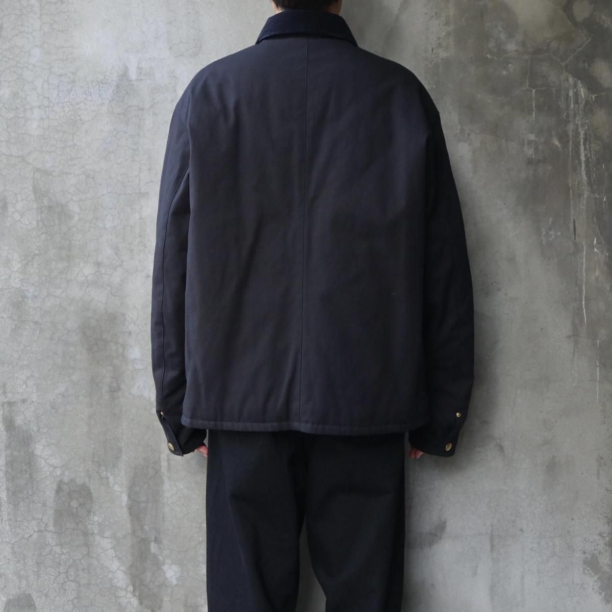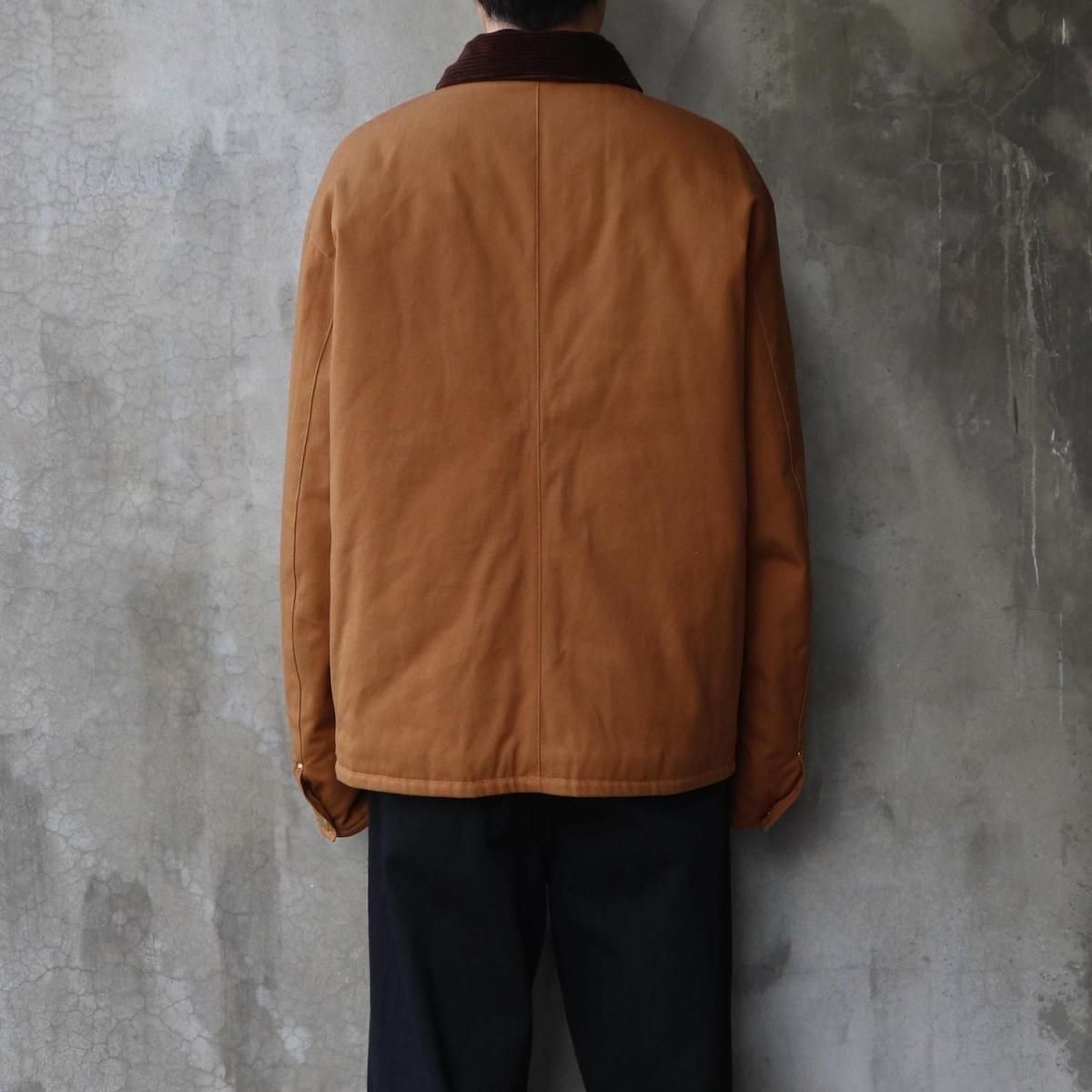 COTTON 100%LINING : NYLON 100%STUFFING : Thinsulate (POLYESTER 100%)膨らみのある風合いのコットンセルヴィッチダック素材を使用した中綿入りダックジャケット。中綿には薄くて軽く暖かいシンサレート素材を採用し、非常に軽量な着心地になっています。UNUSEDでは久しぶりとなるダックジャケットは、現代的にアップデートされたボックスシルエットでの提案。着込むごとにさらに風合いが増し柔らかく育っていく生地の変化も楽しんでいただけます。(生地の特徴)表地(DUCK地):力織機を使用したセルヴィッチダックで、適度な打込みに加え膨らみある風合いを持ち合せた素材です。裏地(NYLON):リサイクルナイロン糸を使用し、環境に配慮されてコーティング加工により防風性を高めた防寒アウター向けの軽量高密度素材を使用しています。ヨコ糸に特殊仮撚り糸を使用することによりシャリ感がありナチュラルなストレッチ表現しています。別布(コーデュロイ) : 360畝の100%コットンコーデュロイです。フラットでしっかりと締まった畝が、美しい表情を生み出します。ブロードライ仕上げにより、パイルがふっくらと立ち上がり、ムラのない鮮やかな発色を実現しています。豊かなふくらみとしっとりとした風合いがあり、手に取ったときの心地よさが際立つ素材です。size 3 : 着丈70 身幅66 肩幅55 袖丈64cmmodel : 173cm 60kg 着用サイズ3