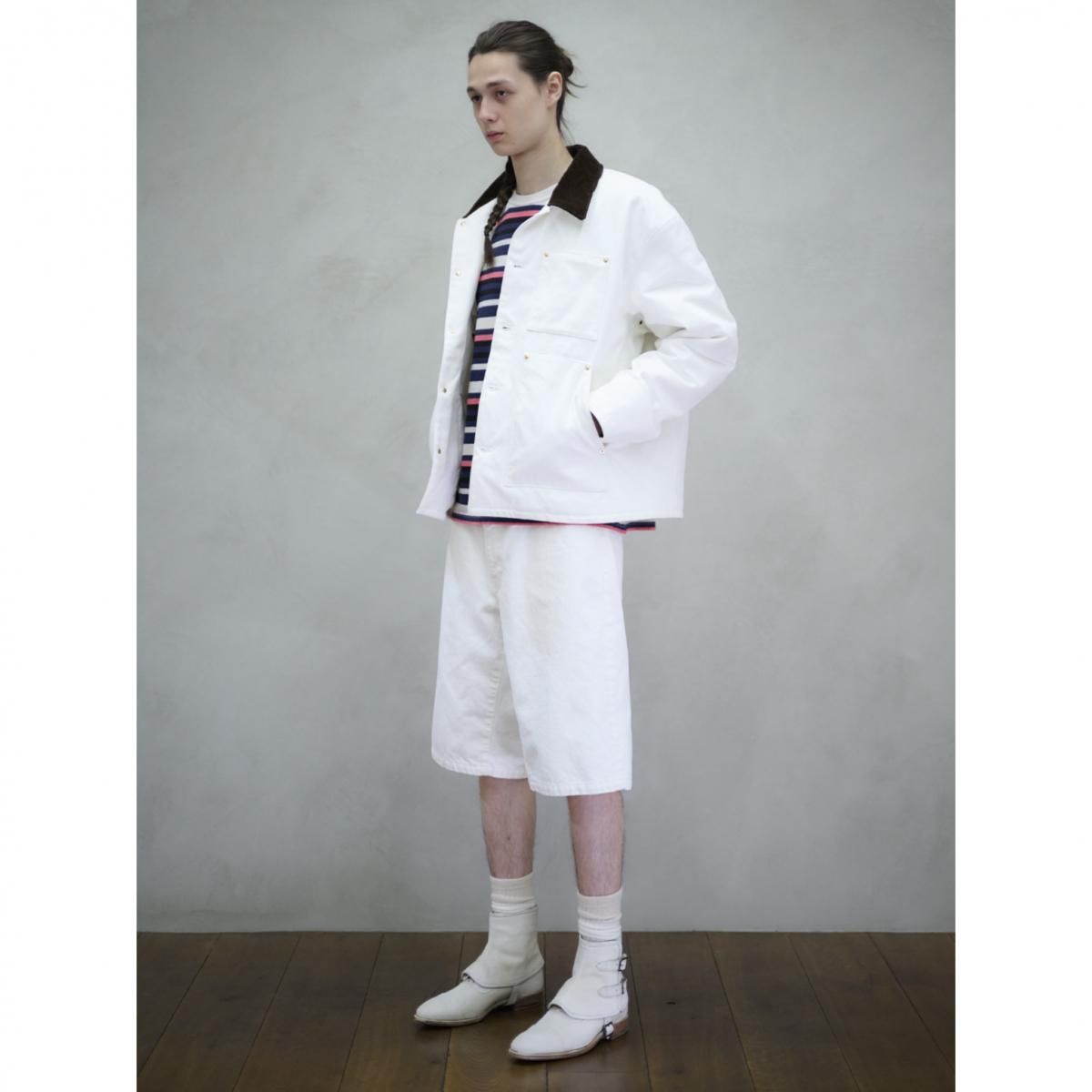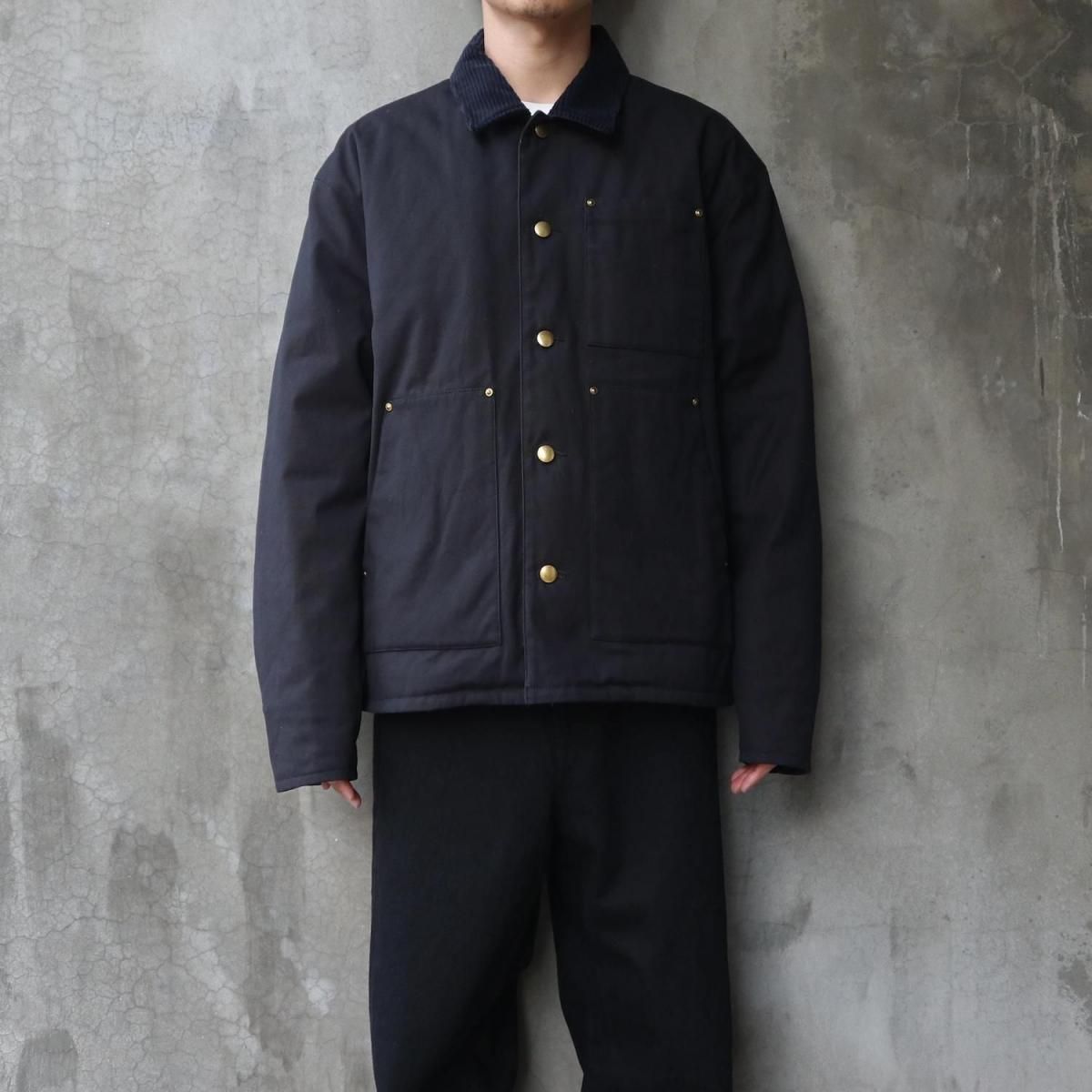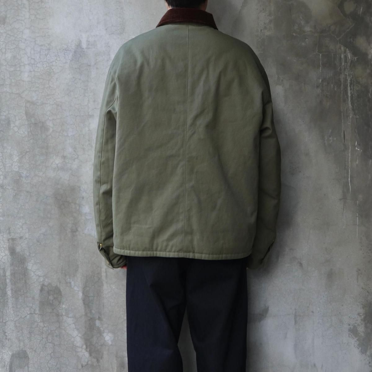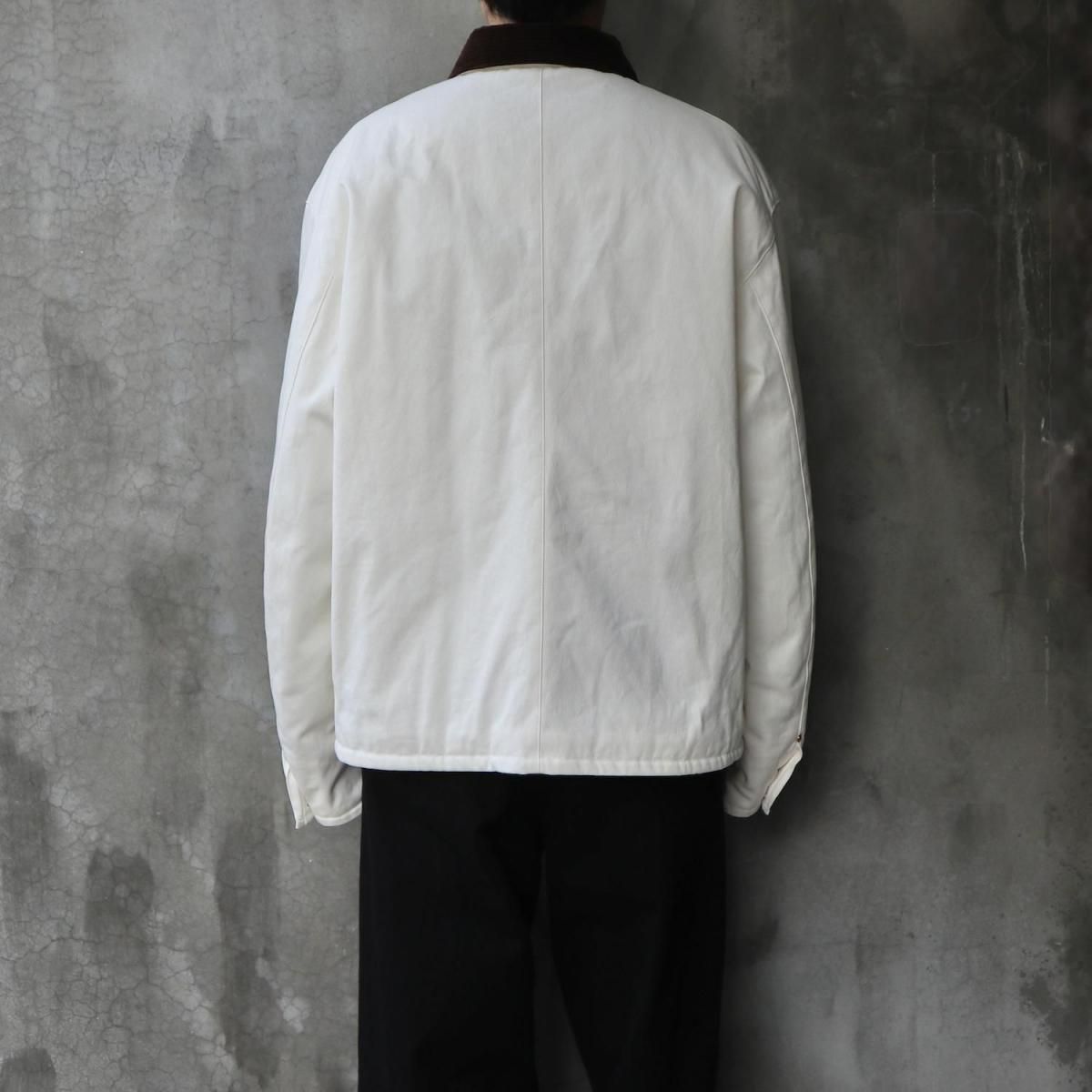 COTTON 100%LINING : NYLON 100%STUFFING : Thinsulate (POLYESTER 100%)膨らみのある風合いのコットンセルヴィッチダック素材を使用した中綿入りダックジャケット。中綿には薄くて軽く暖かいシンサレート素材を採用し、非常に軽量な着心地になっています。UNUSEDでは久しぶりとなるダックジャケットは、現代的にアップデートされたボックスシルエットでの提案。着込むごとにさらに風合いが増し柔らかく育っていく生地の変化も楽しんでいただけます。(生地の特徴)表地(DUCK地):力織機を使用したセルヴィッチダックで、適度な打込みに加え膨らみある風合いを持ち合せた素材です。裏地(NYLON):リサイクルナイロン糸を使用し、環境に配慮されてコーティング加工により防風性を高めた防寒アウター向けの軽量高密度素材を使用しています。ヨコ糸に特殊仮撚り糸を使用することによりシャリ感がありナチュラルなストレッチ表現しています。別布(コーデュロイ) : 360畝の100%コットンコーデュロイです。フラットでしっかりと締まった畝が、美しい表情を生み出します。ブロードライ仕上げにより、パイルがふっくらと立ち上がり、ムラのない鮮やかな発色を実現しています。豊かなふくらみとしっとりとした風合いがあり、手に取ったときの心地よさが際立つ素材です。size 3 : 着丈70 身幅66 肩幅55 袖丈64cmmodel : 173cm 60kg 着用サイズ3