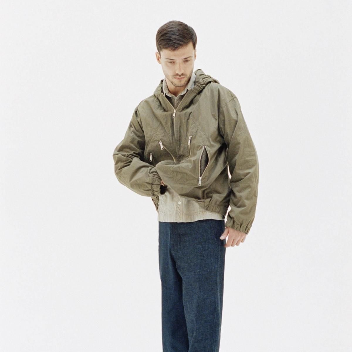 FACE : COTTON 100%ANOTHER FABRIC : WOOL 90% NYLON 10%MADE IN JAPAN製品洗い加工ハリコシのあるコットンタイプライター素材を使用したフーデッドブルゾン。M-65フィッシュテールパーカーからデザインソースを得たディテールを搭載しています。M-65のポケットの内側には寒冷地でも使用するので、手を温めるためのウールの生地が挟み込まれています。このウールの生地を挟み込む構造をさらにアップデートさせたのがこの品番です。ウールの生地を挟み込むことで、表面と裏面の両方から使うことの出来るポケットを設計しました。またウールの生地をフードや袖口にも挟み込むことで生地の厚みが増し、ボリュームのあるシルエットを作り出しています。ジップは開閉できませんが、リバーシブルでもお楽しみいただけます。size 2 : 着丈71 身幅66 肩幅53 袖丈64cm