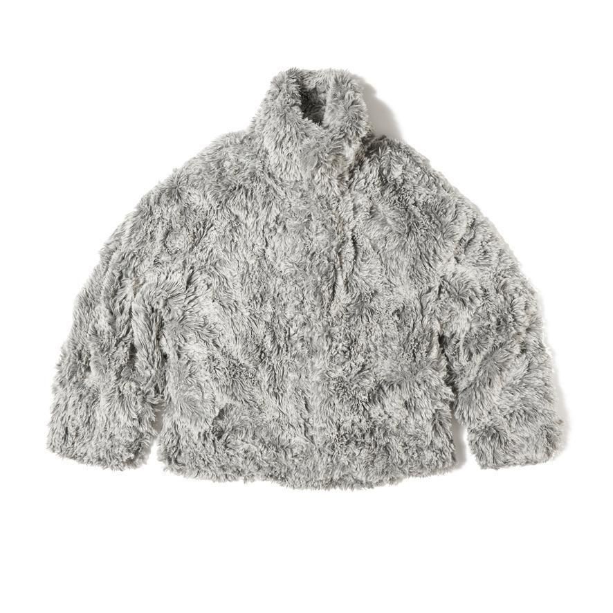 ACRYLIC 100%GROUND : ACRYLIC 55% POLYESTER 45%INSIDE : CUPRA 100%前から見るとエレガントなファージャケット。しかし、背中を見ると不気味に口を開いたモンスターが。その邪悪な微笑みは、見る人に恐怖を与えるのではなく、会話のきっかけになるもの。乱れた毛並みは、従来のエレガンスからはかけ離れているものの、ハイカラーの仕立てが上品さを感じさせます。エレガンスの固定観念を噛み砕き、従来の枠から一歩踏み出そうとするこのファージャケットを異端とするか、新しいエレガンスの形と捉えるか。見方次第で、このジャケットの印象は大きく変わるのかもしれません。size M : 着丈74 肩幅60 身幅69 袖丈63cmmodel : 173cm 60kg 着用サイズM