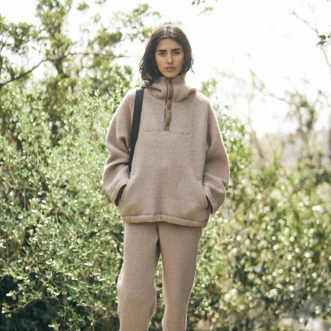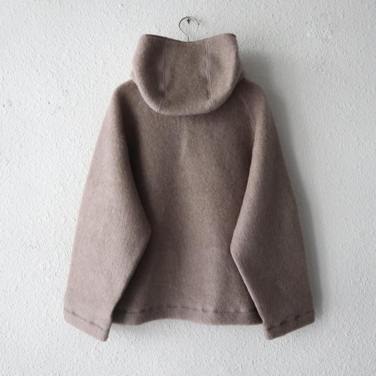 WOOL 73% POLYESTER 27%軽くふんわりと厚みのあるパイルジャージーに起毛加工を施し、シャギーな表情をもつカットソー素材に仕上げました。パイルが空気を含むことで保温性が高く、ウールならではのあたたかさをしっかりと感じられます。前スナップ開きのフード付きプルオーバー型で、裾のドローコードによりシルエットの調整も可能。ストッパーには豚革を使用しています。size S : 着丈62 身幅57.5 裄丈76cm