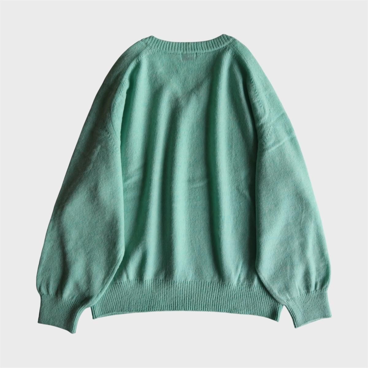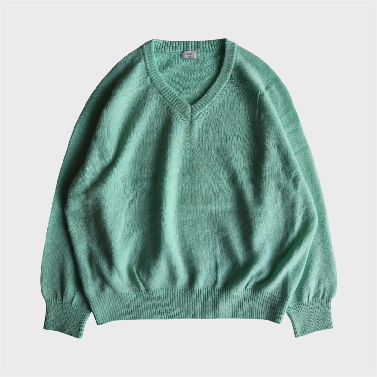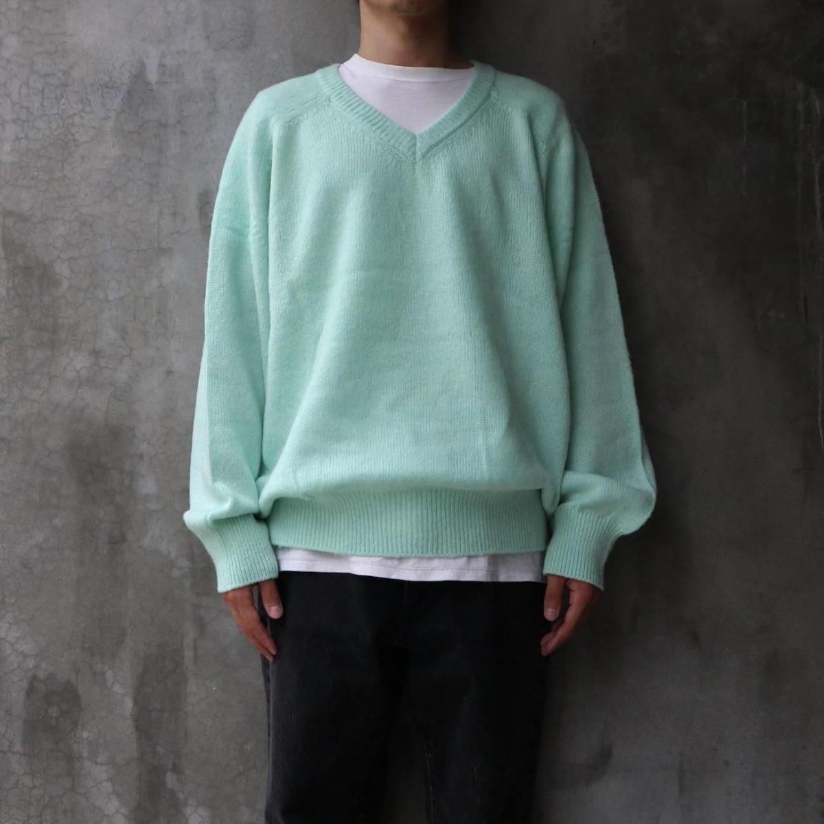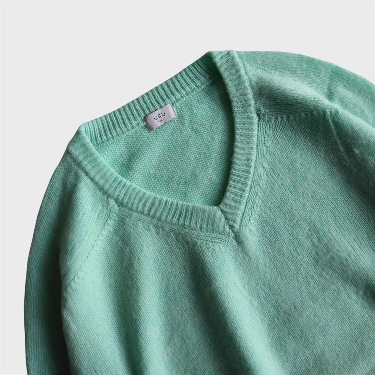 WOOL 100%ウール素材を使用したVネックニット。柔らかな風合いと微起毛をかけた温かみのある表情が特徴です。この素材と相まって、発色の良いライトグリーンの色味もURUらしい仕上がりです。ゆったりとしたサイジングと汎用性の高いシンプルなデザインに仕上げています。size 2 : 着丈65 身幅72 裄丈85.5cmmodel : 173cm 60kg 着用サイズ2