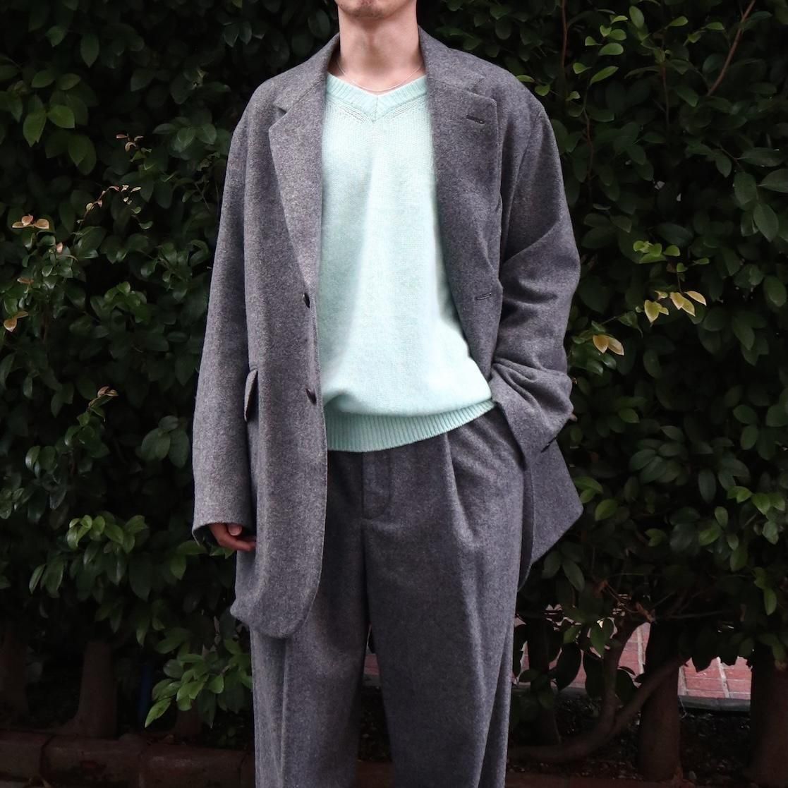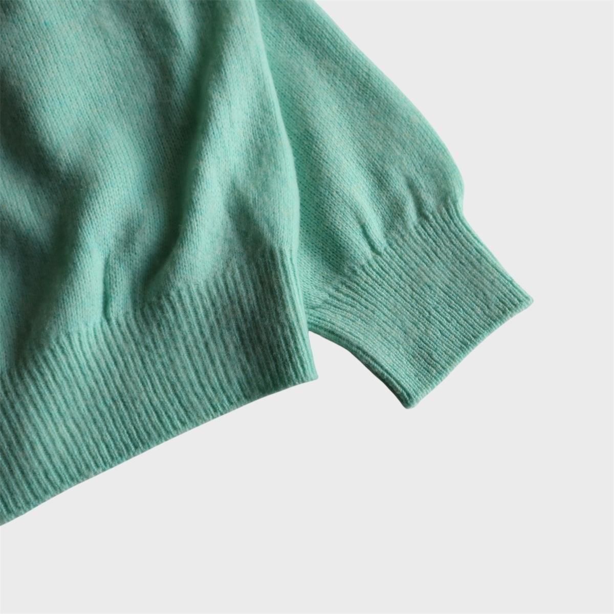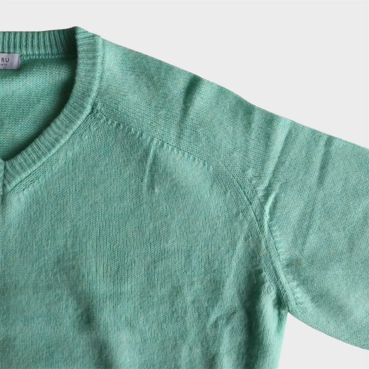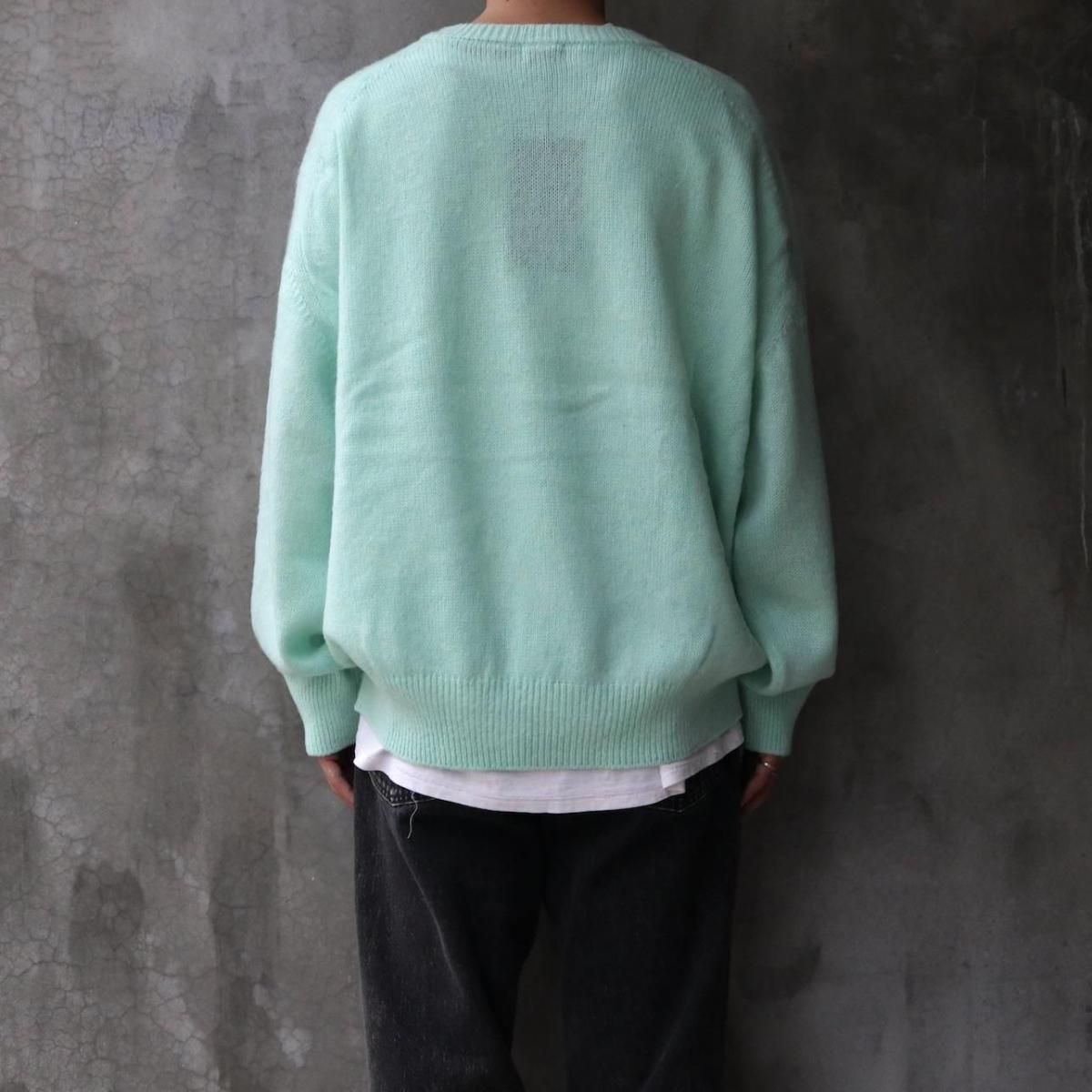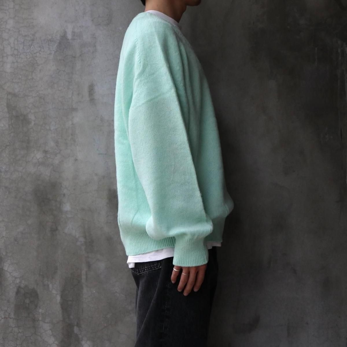 WOOL 100%ウール素材を使用したVネックニット。柔らかな風合いと微起毛をかけた温かみのある表情が特徴です。この素材と相まって、発色の良いライトグリーンの色味もURUらしい仕上がりです。ゆったりとしたサイジングと汎用性の高いシンプルなデザインに仕上げています。size 2 : 着丈65 身幅72 裄丈85.5cmmodel : 173cm 60kg 着用サイズ2