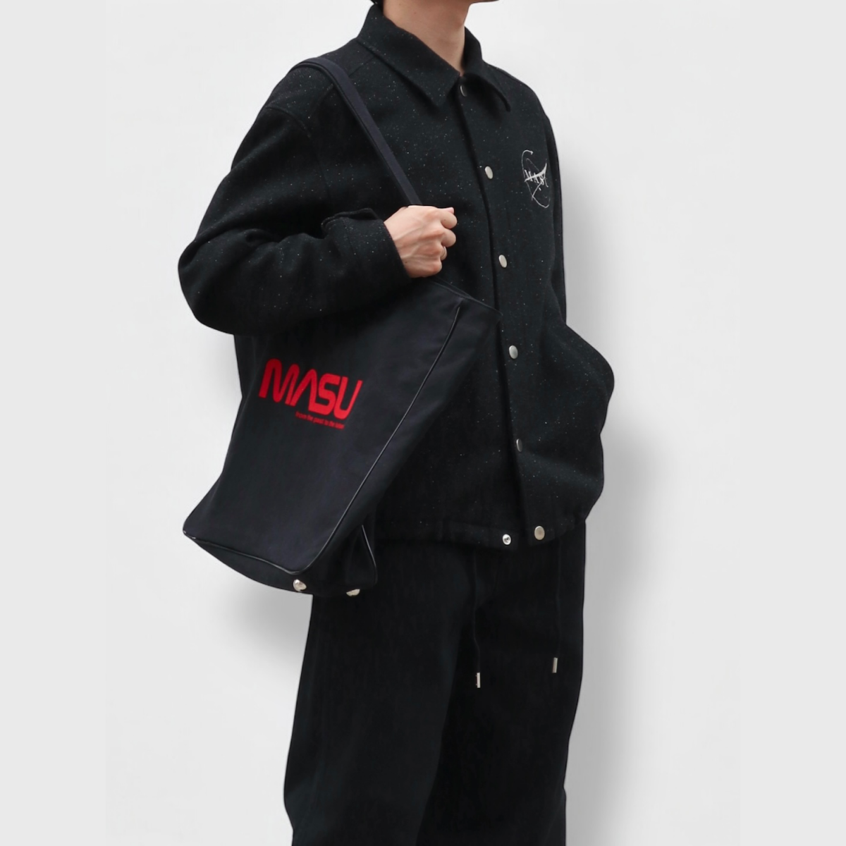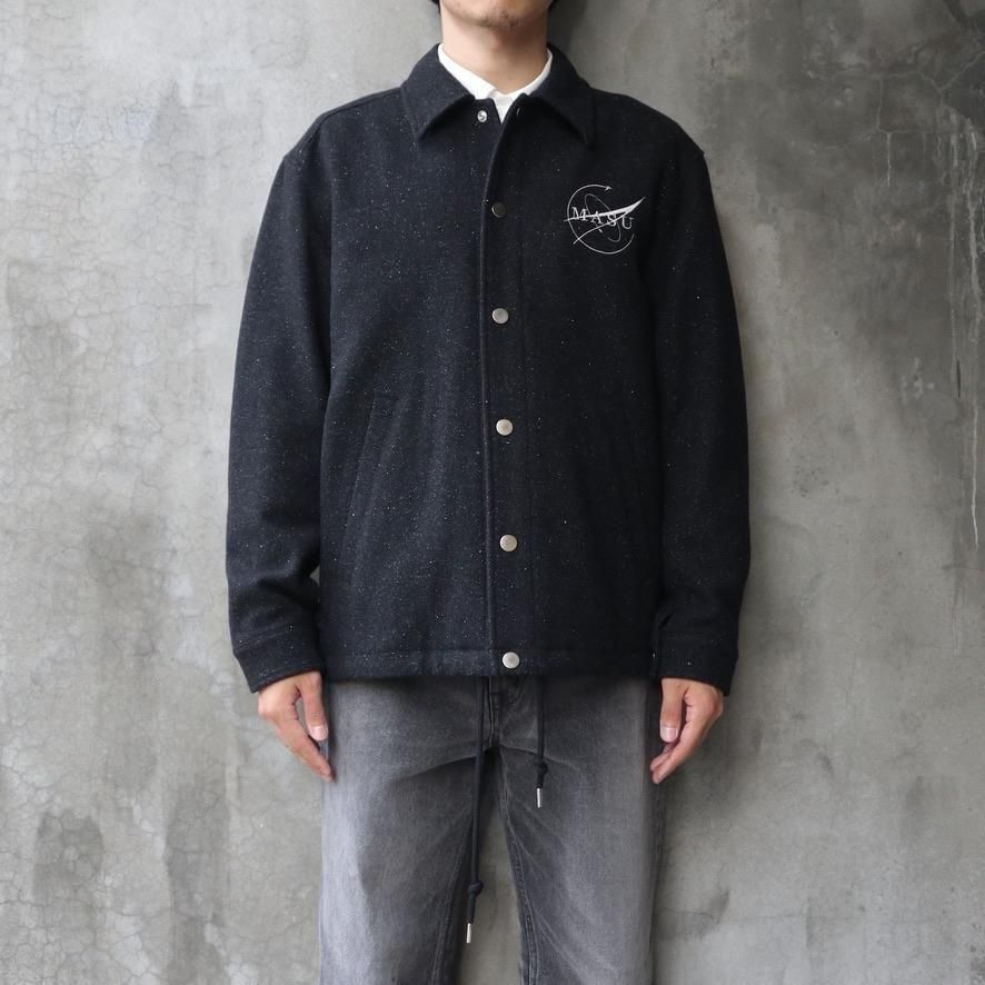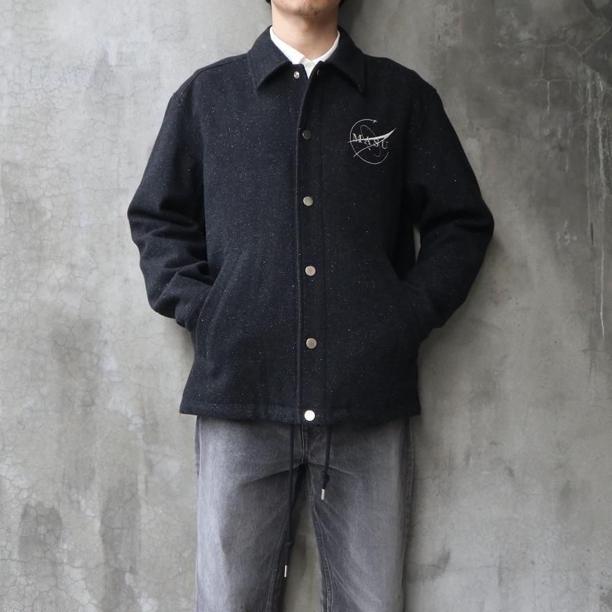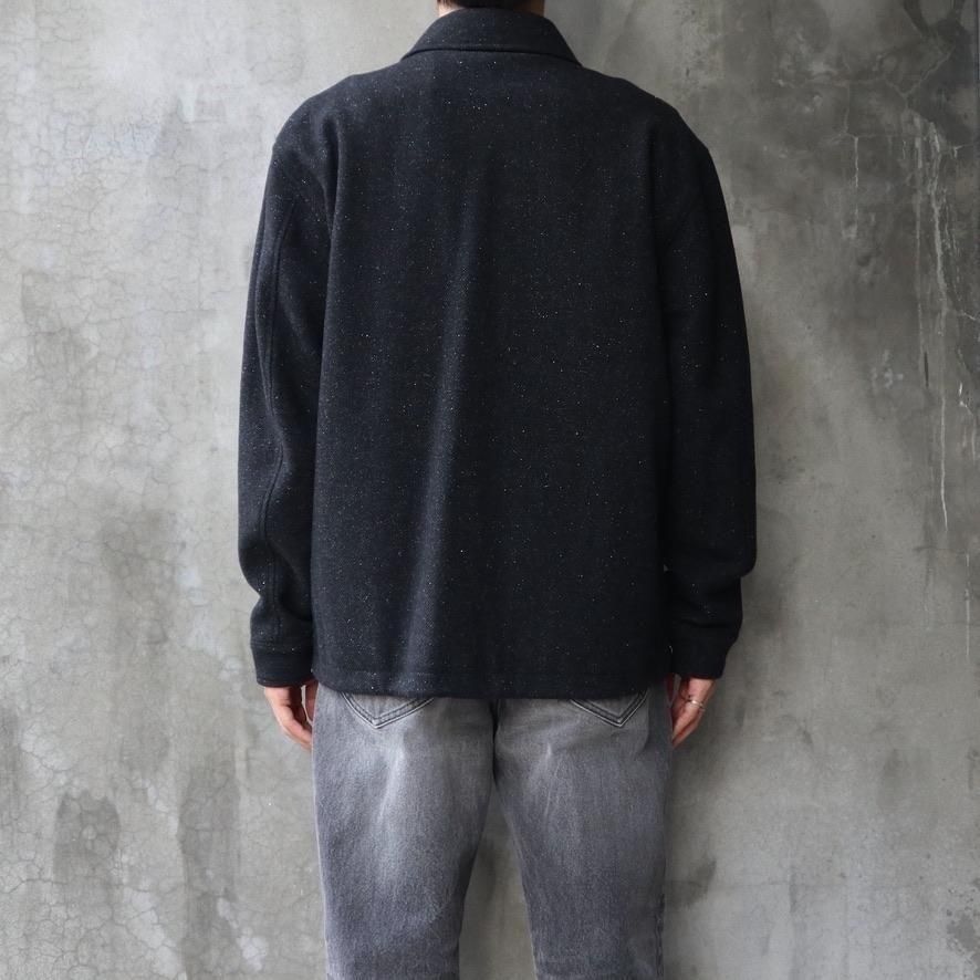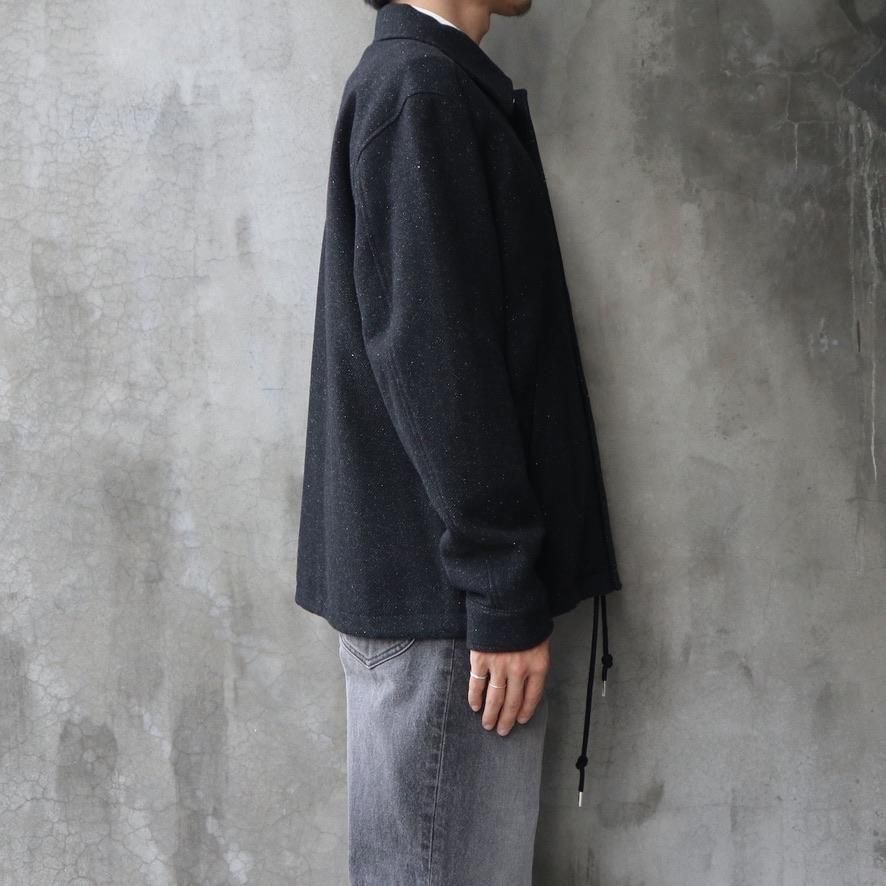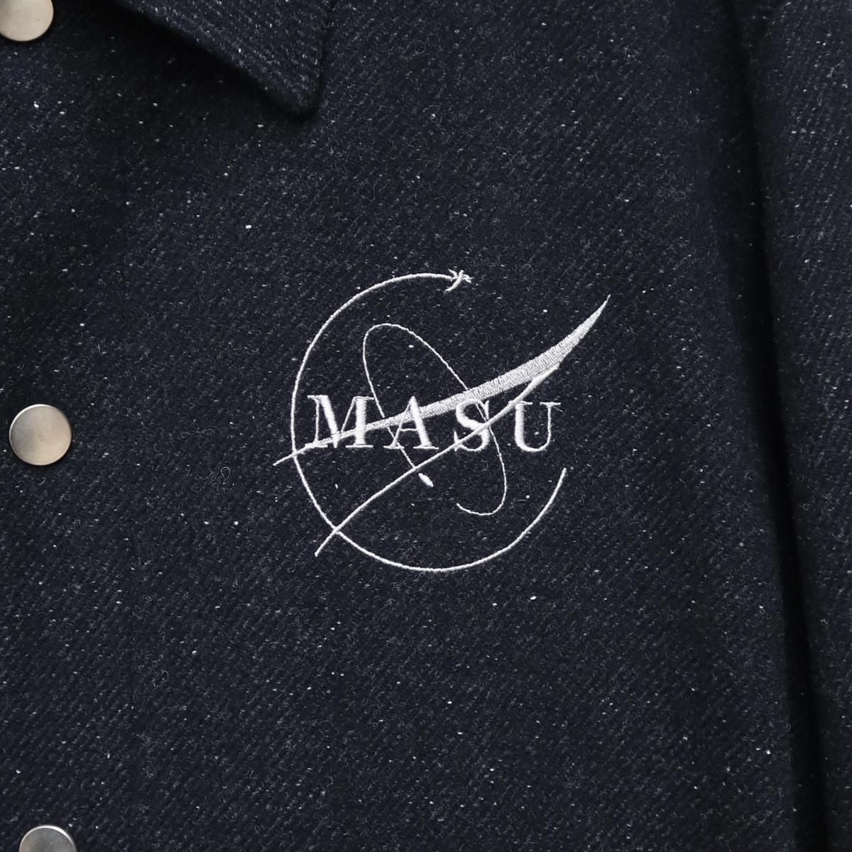 SHELL : WOOL 92% NYLON 5% SILK 3%LINING : CUPRO 100%EMBROIDERY : RAYON 100%総裏仕様のクルージャケット。滑らかで美しいドレープが特徴のネップの入ったツイルメルトンを使用。縦長のリラックスしたバランスのシルエット。MASUという舟に乗って共に旅をするクルーのために作られた。長いシーズン着用が可能な万能な1着。size 46 : 着丈69 肩幅51.5 身幅59 袖丈61cmmodel : 173cm 60kg 着用サイズ46