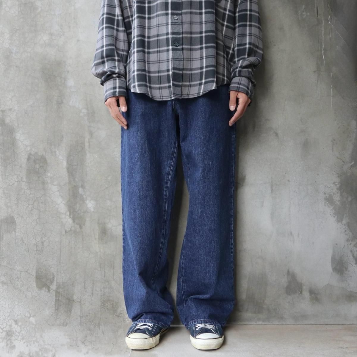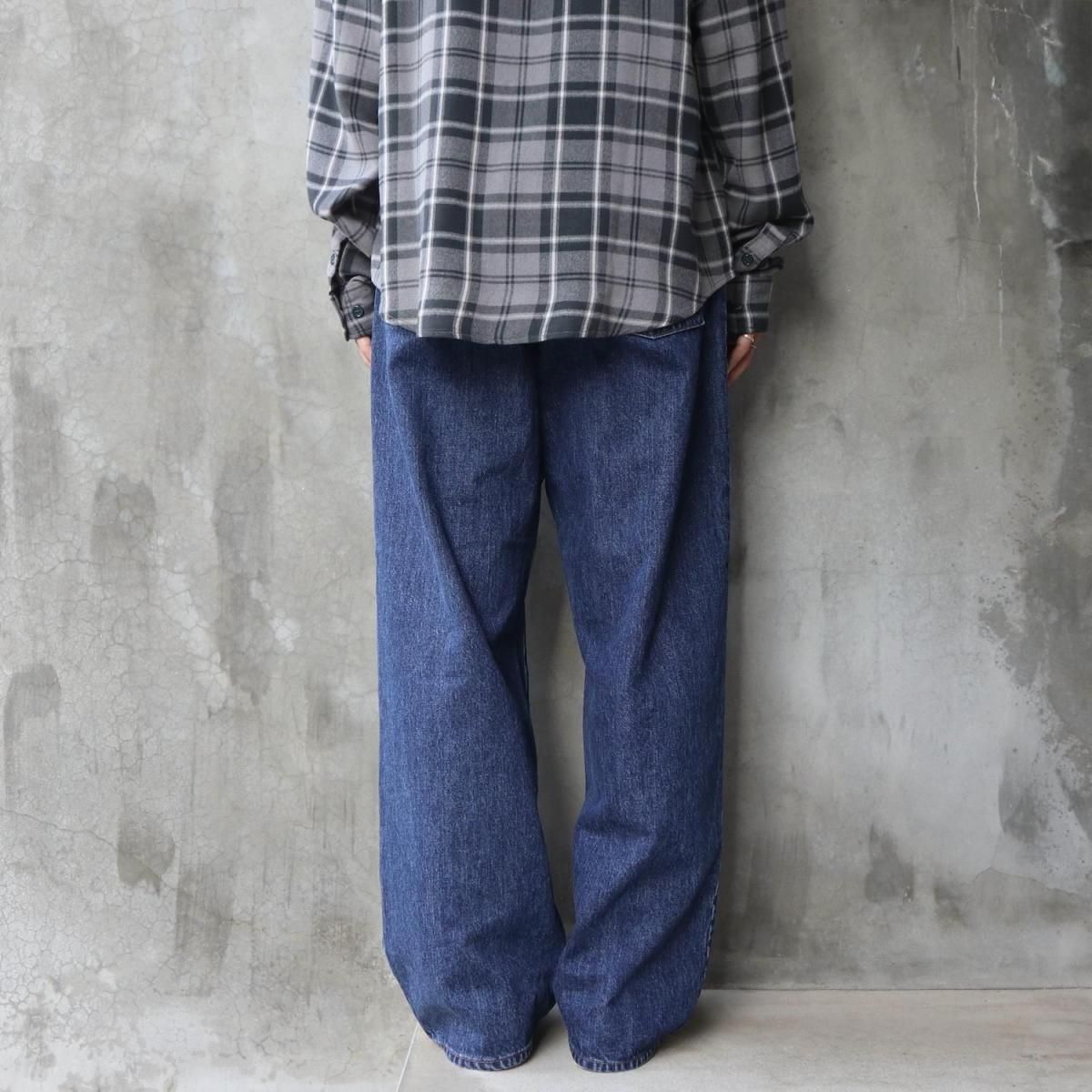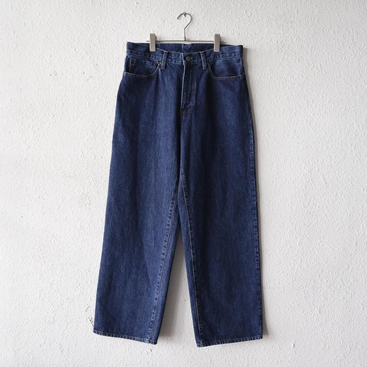 COTTON 100%14oz DENIMTALON ZIPPERBIO WASH & OVER DYE14オンスコットンデニム素材を使用したバギーパンツ。バイオウォッシュ、オーバーダイ加工を施したアタリや色ムラのある生地表情が特徴です。ワイドストレートシルエットになります。(生地の特徴)INDIGO : リーバイス66前期の製品を紐解きリプロダクトしたデニムで、異なる数種のムラ形状の糸を使いタテのシャープなムラ感を再現。BLACK : タテヨコにムラ糸を使用した3/1綾デニムで、程よいムラ感ですっきりとした表情になります。タテ糸はロープ染色により芯白に染まっており、経年変化をお楽しみ頂けます。size 2 : W84 股上40 股下75.5 裾幅26cmsize 3 : W90 股上40 股下77 裾幅26.5cmmodel : 173cm 60kg 着用サイズ2