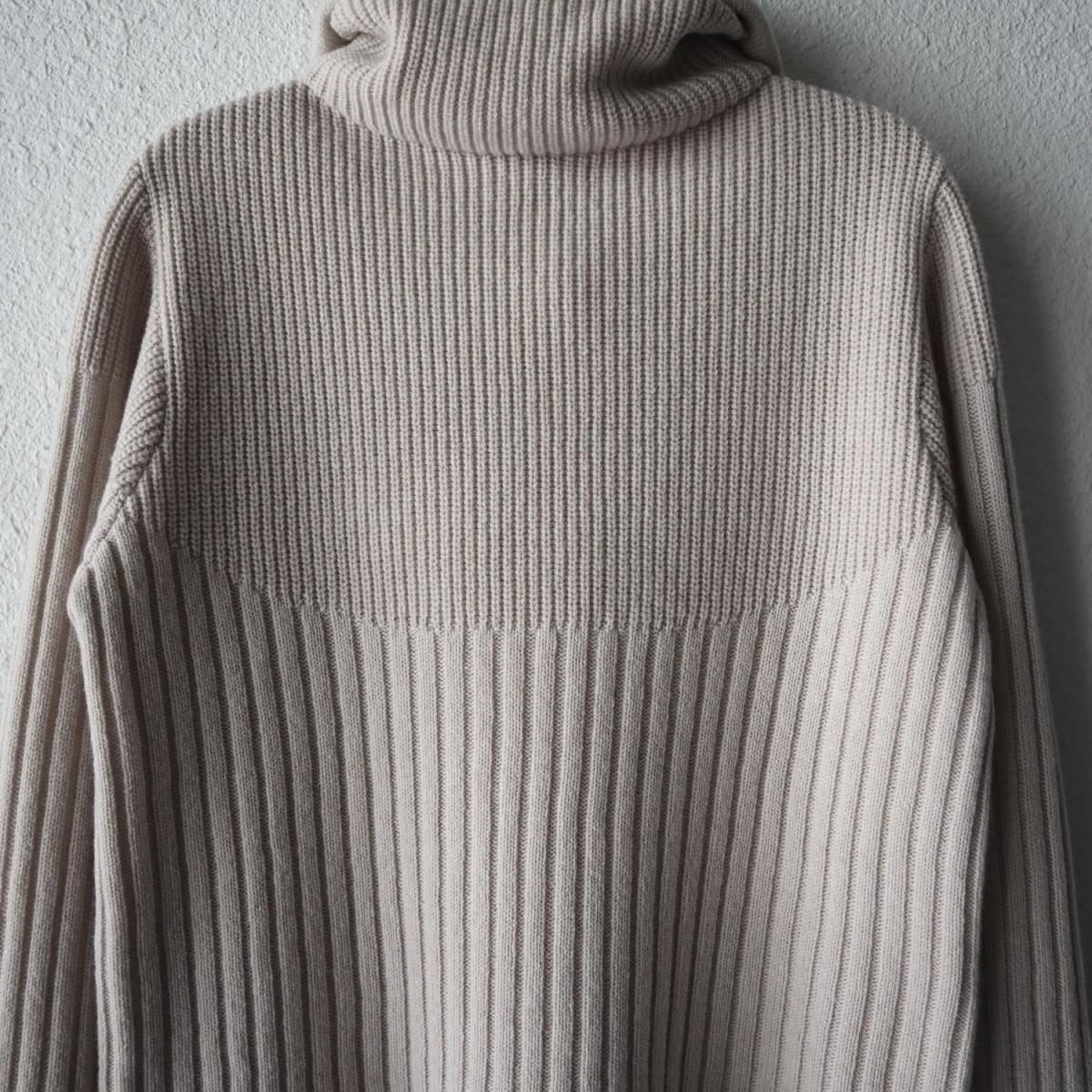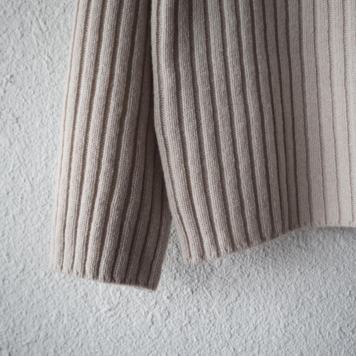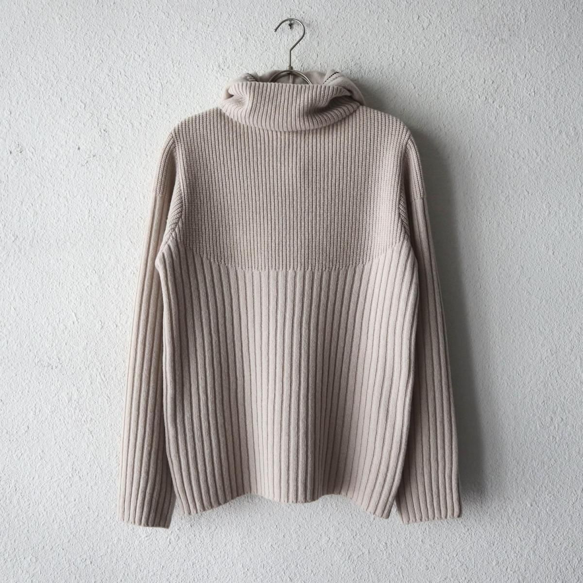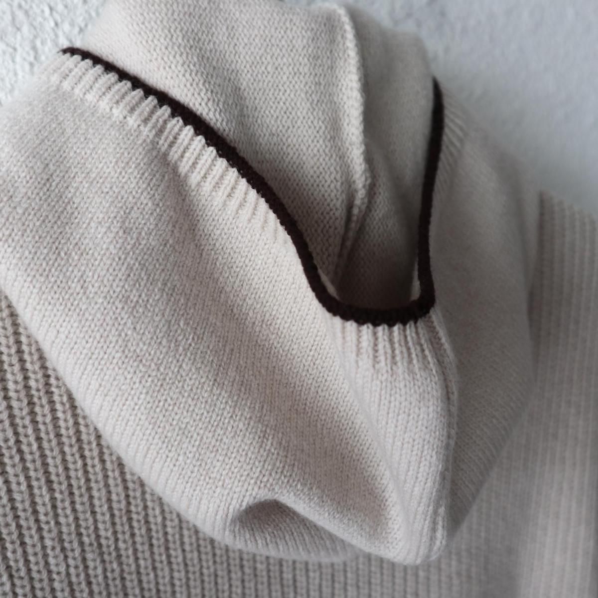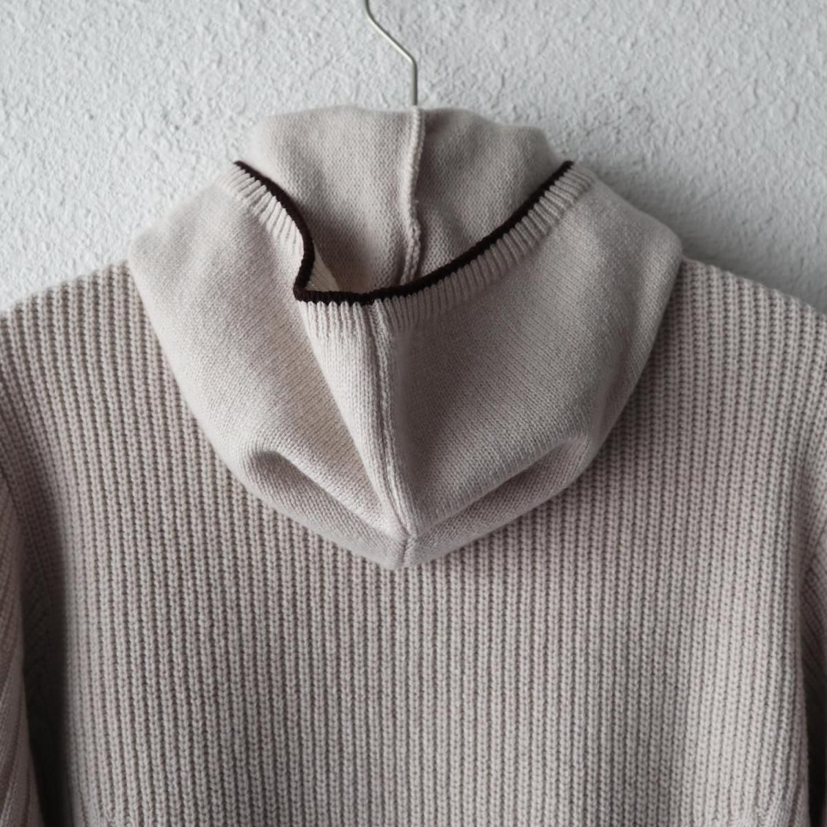 WOOL 100%カシミヤのように滑らかで、軽く暖かな上質ウールを使用したフーディニット。フードまわりには繊細な配色ラインを施し、程よいアクセントに。首元まで暖かく包み込みつつ、脱いでも邪魔にならない絶妙なサイズ感のフードが魅力です。size F : 着丈63 身幅53 肩幅39 袖丈61cm