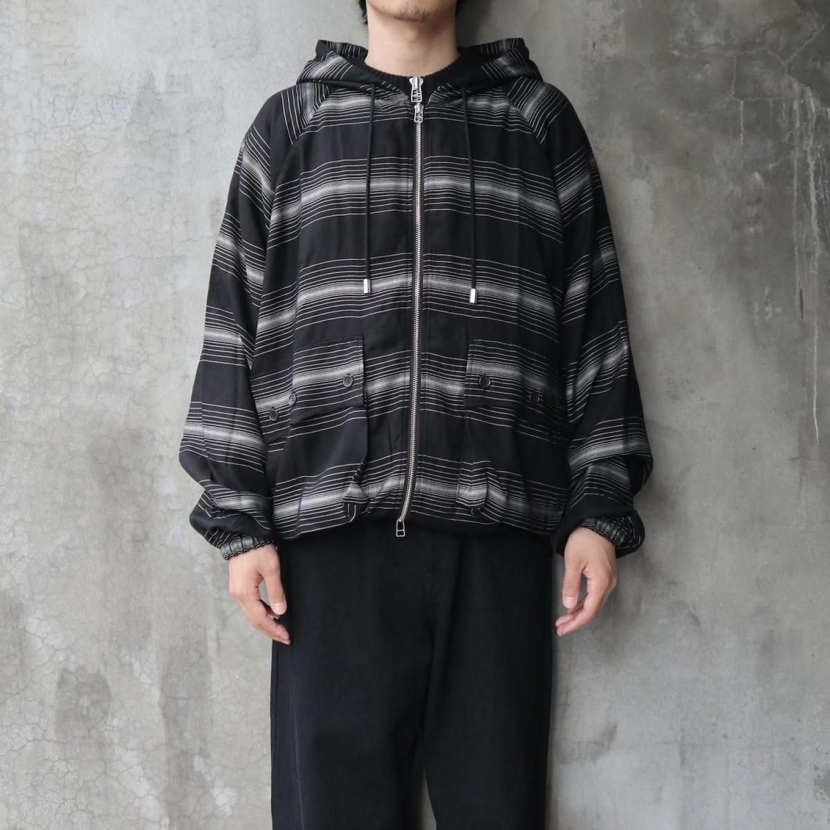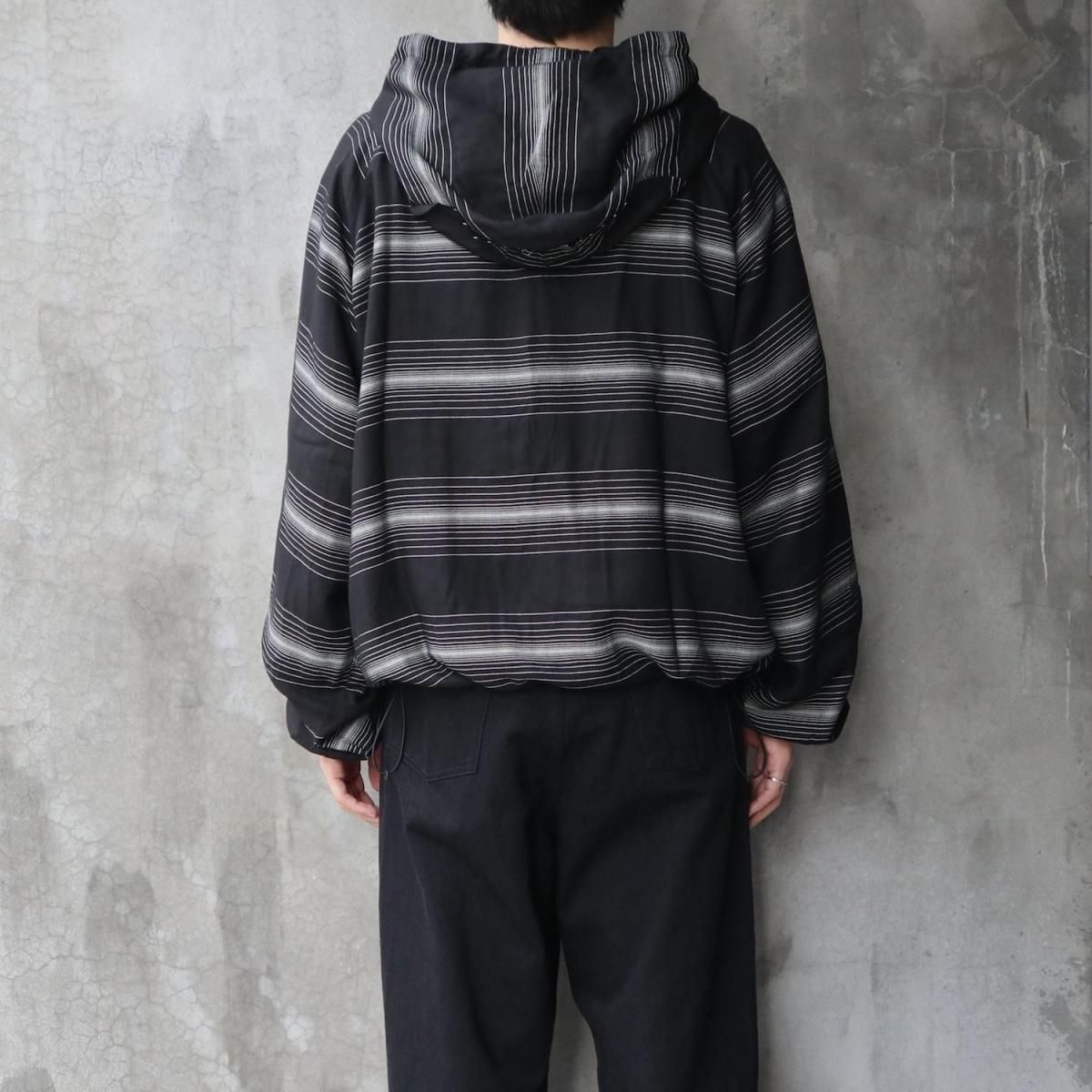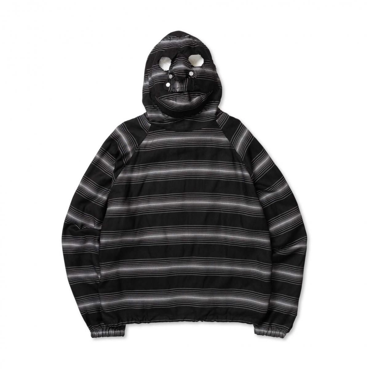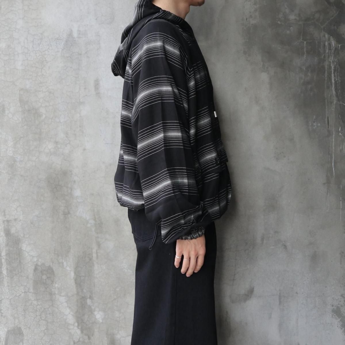 RAYON 90% POLYESTER 5% POLYPROPYLENE 5%MADE IN JAPANフードの背面にマスクを配したROTOLらしいデザインが特徴のジップパーカー。前後関係なく着用可能なパターンにより、マスク側(後側)を正面にも着用できる。素材には"GLOWRIA"という蓄光素材を使用したオリジナルストライプレーヨンツイルを採用。size 3 : 着丈62.5 身幅72 裄丈92cmmodel : 173cm 60kg 着用サイズ2