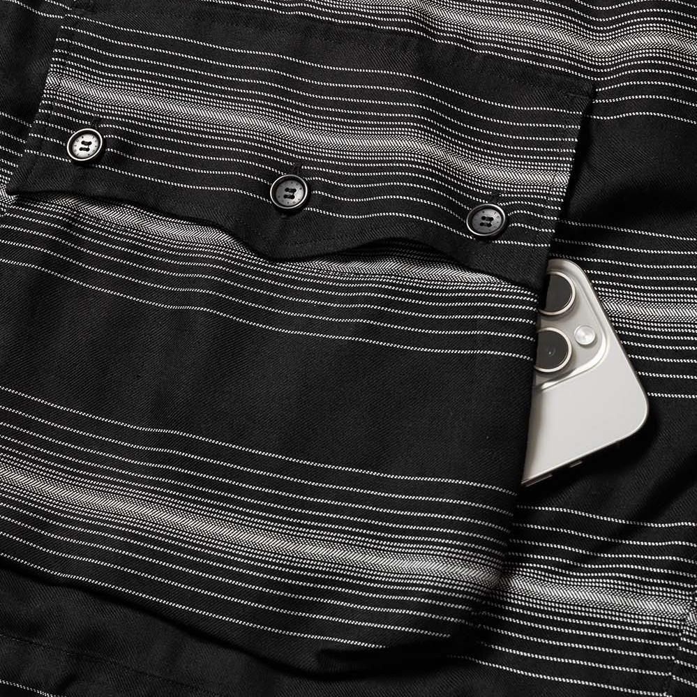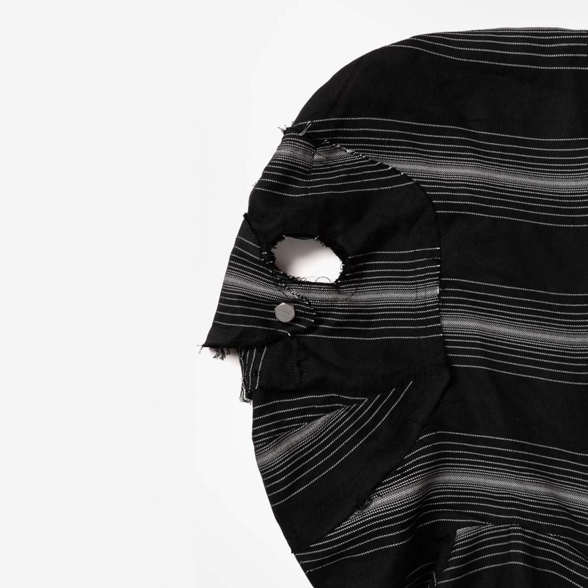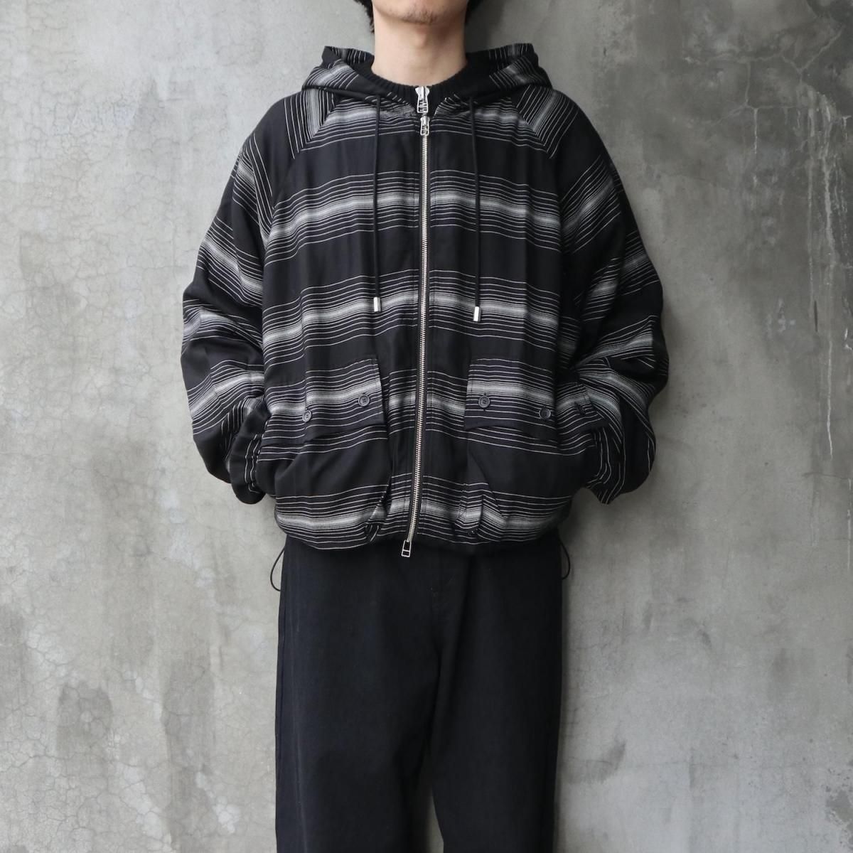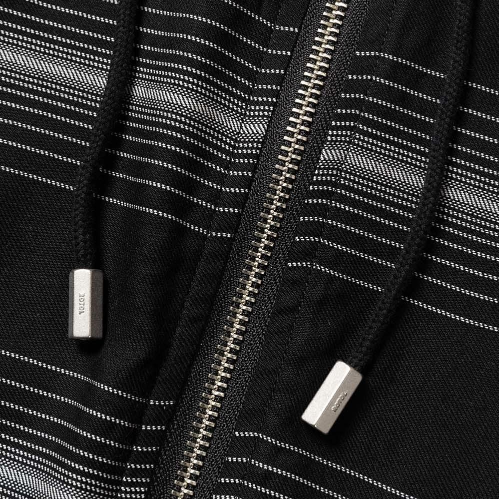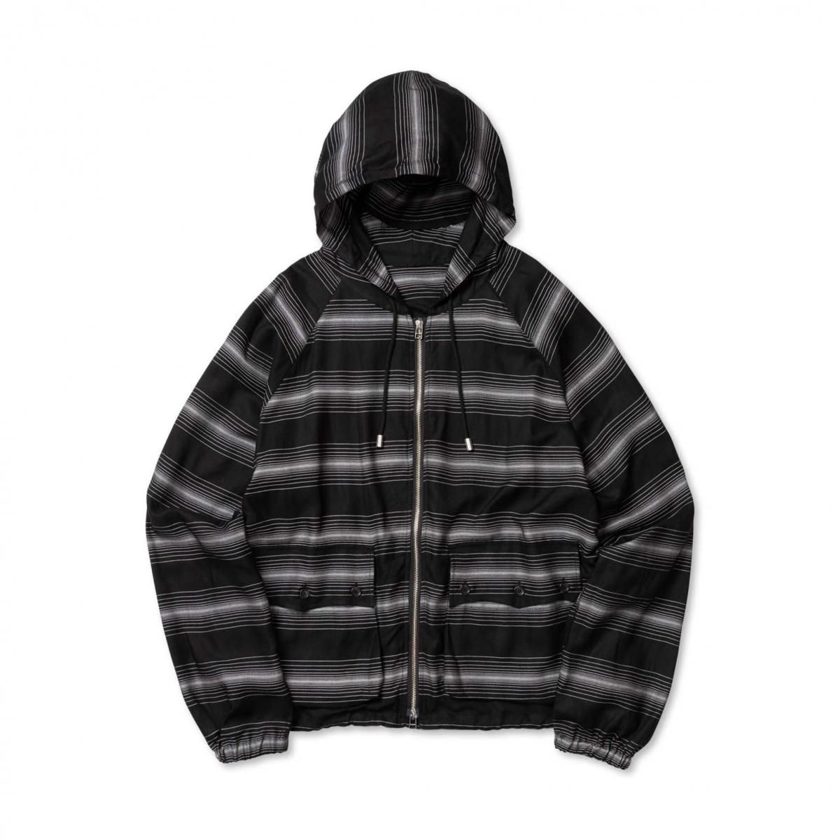 RAYON 90% POLYESTER 5% POLYPROPYLENE 5%MADE IN JAPANフードの背面にマスクを配したROTOLらしいデザインが特徴のジップパーカー。前後関係なく着用可能なパターンにより、マスク側(後側)を正面にも着用できる。素材には"GLOWRIA"という蓄光素材を使用したオリジナルストライプレーヨンツイルを採用。size 3 : 着丈62.5 身幅72 裄丈92cmmodel : 173cm 60kg 着用サイズ2