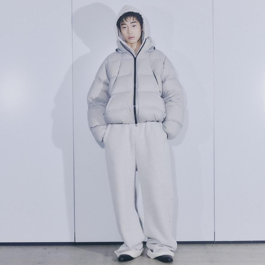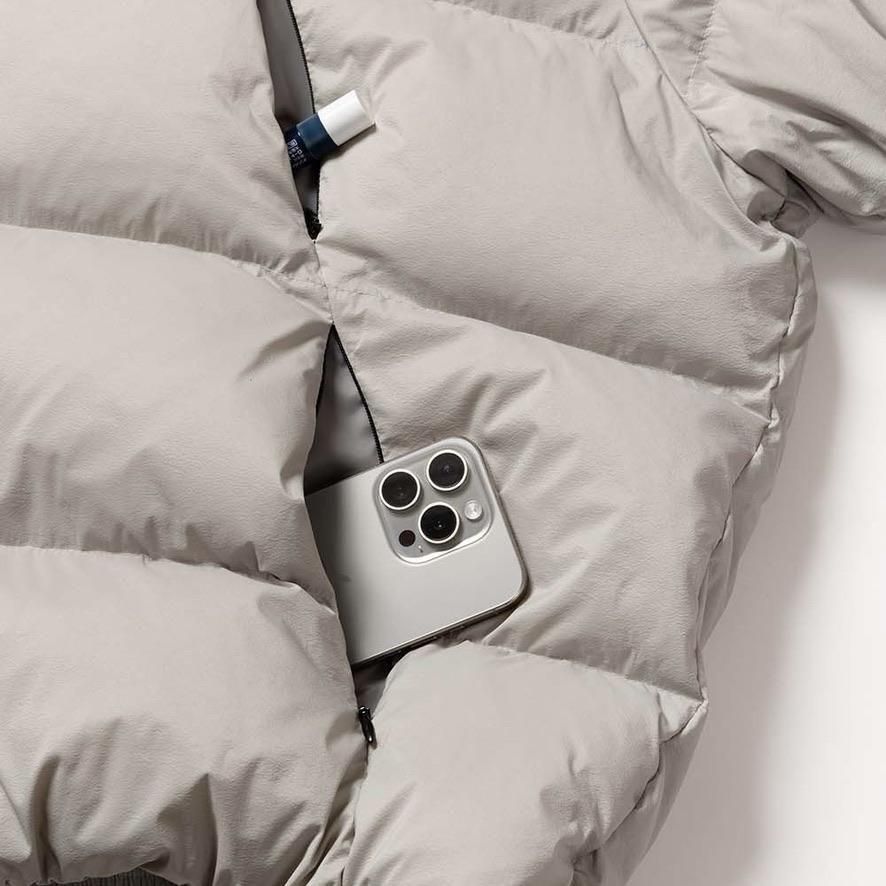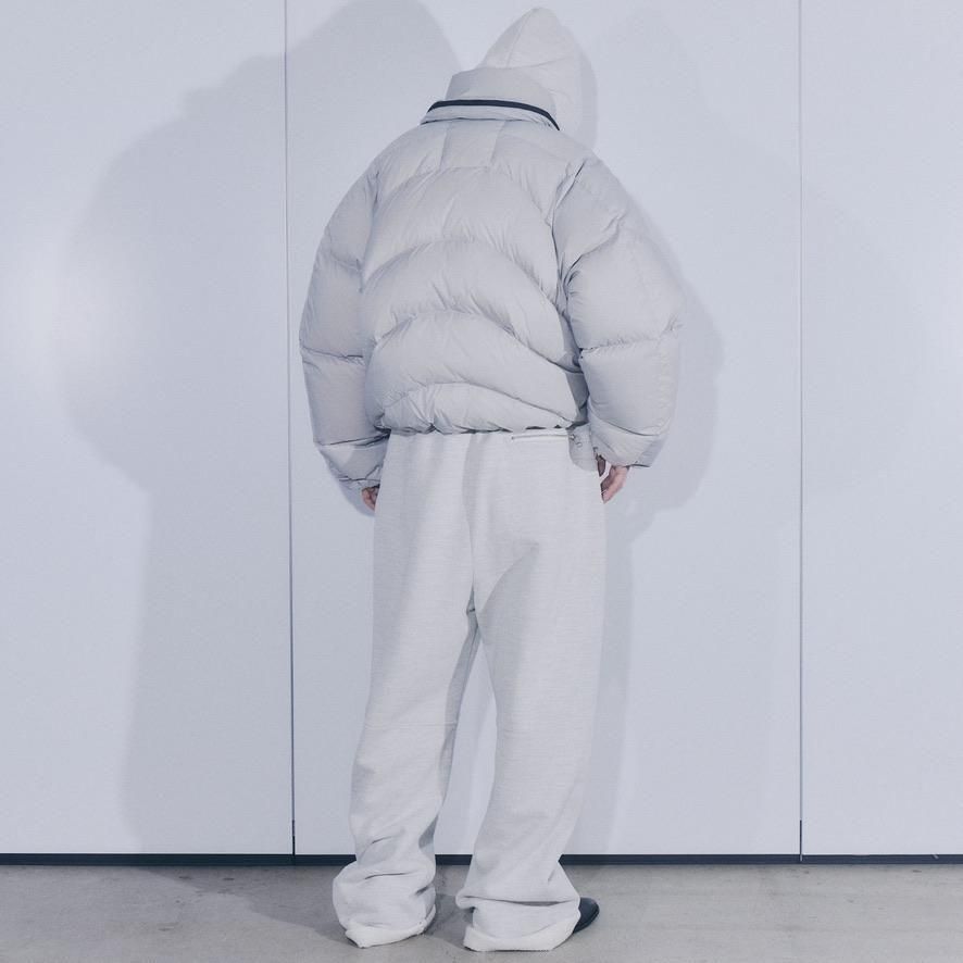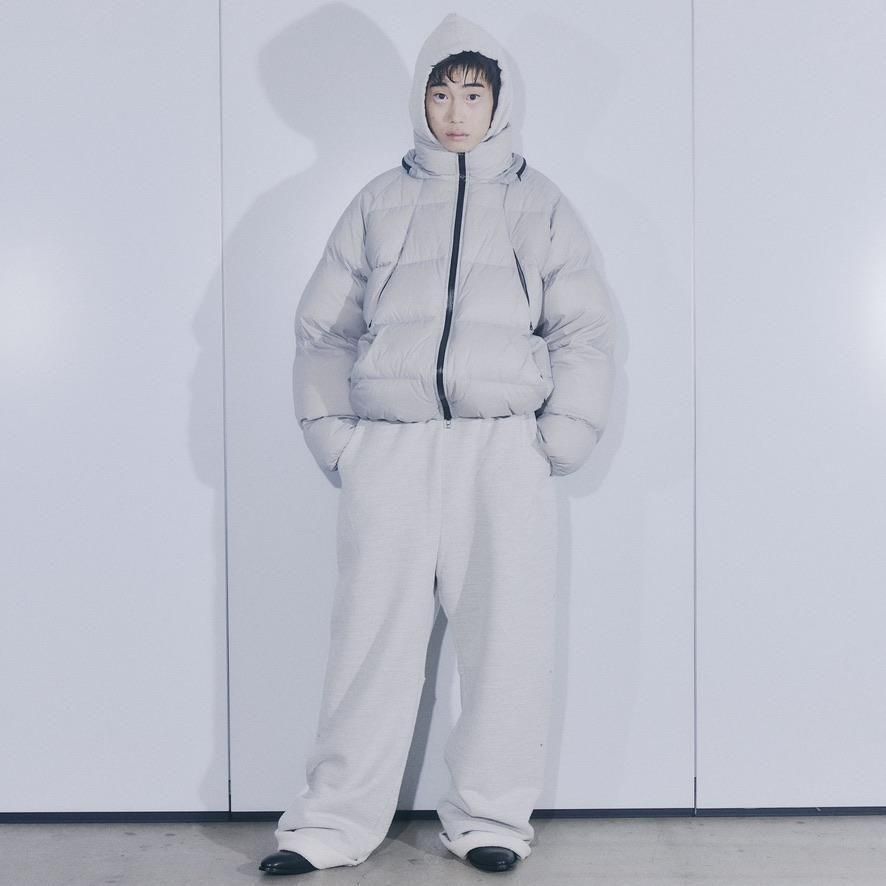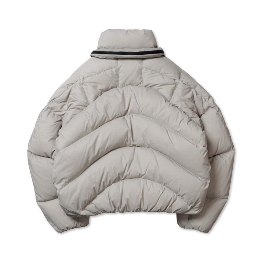 NYLON 100%LINING : POLYESTER 100%MESH : POLYESTER 100%WAD : DOWN 90% FEATHER 10%ステッチデザインによるカーブと首に付けられた収納フードが特徴のダウンジャケット。ハの字のジップ内ポケットは上下で仕切られており、フロント内側にはメッシュポケットを採用するなど大容量の収納システムになっています。肩はラグランスリーブ仕様、袖口と裾口にドローコードを配することでシルエットを調節することも可能。