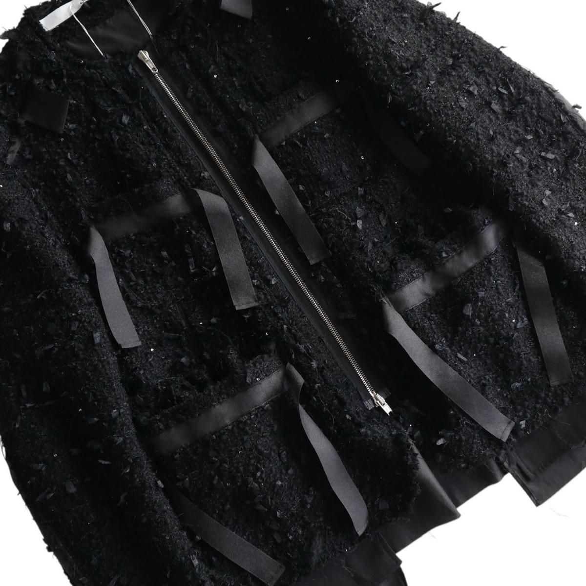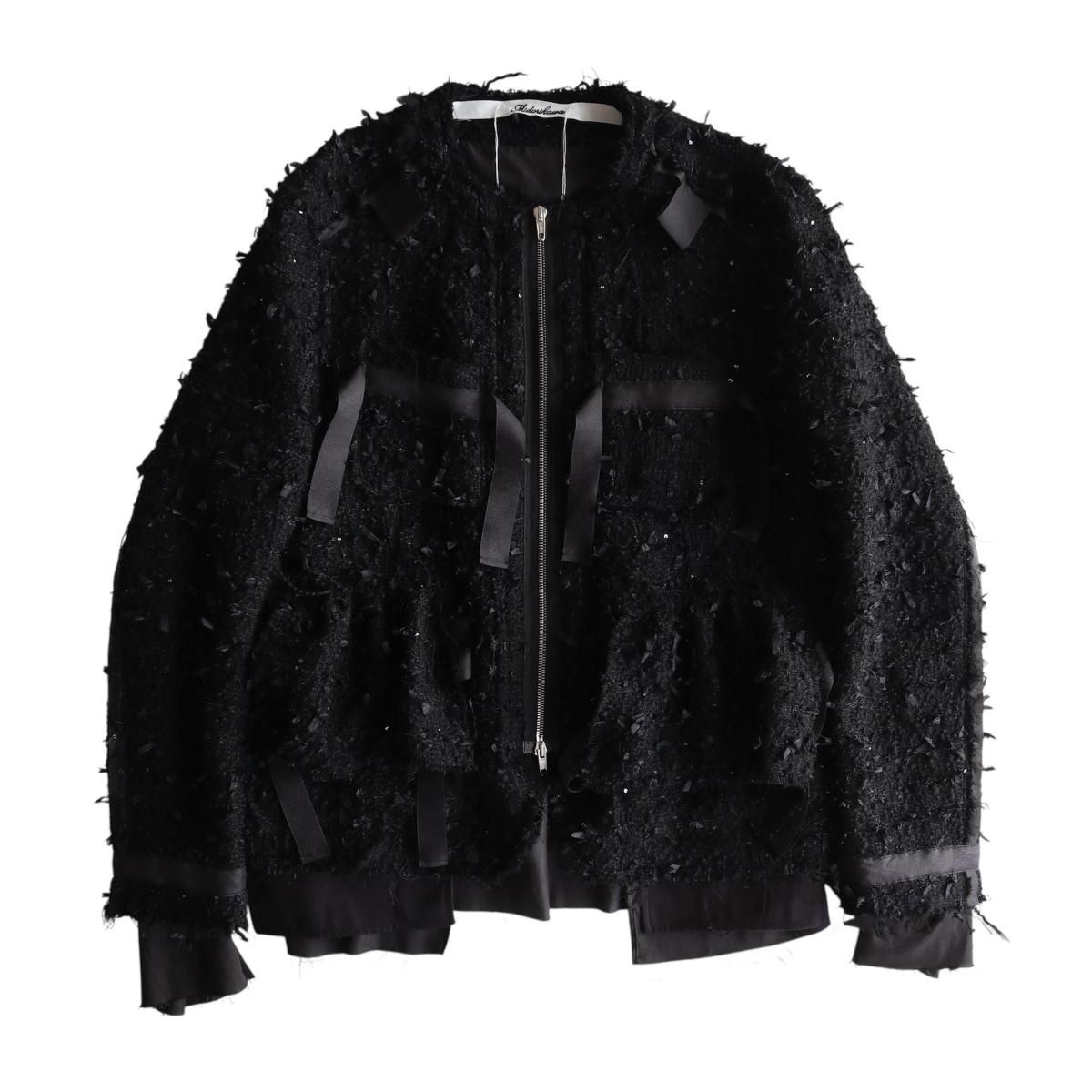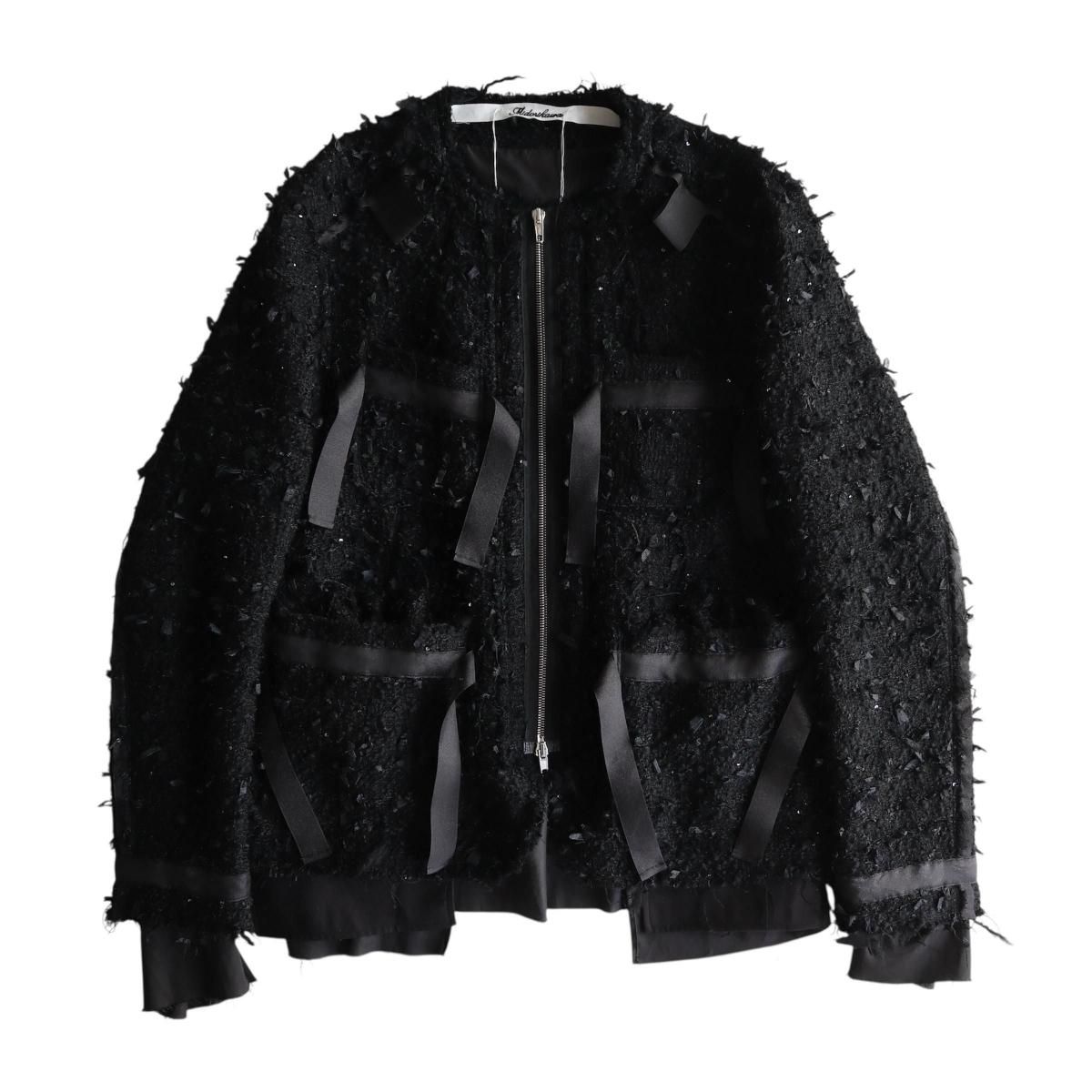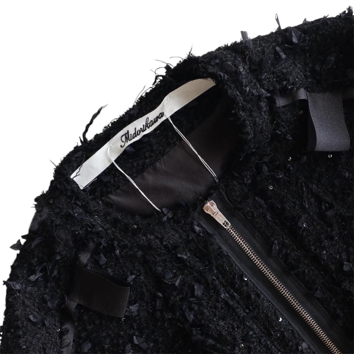 SHELL : WOOL 66% NYLON 22% POLYESTER 8% RAYON 3% ACRYLIC 1%LINING : RAYON 54% COTTON 46%ANOTHER : COTTON 100%MADE IN JAPAN経緯8種類の糸を使用したオリジナルツイードMidorikawaオリジナルツイード素材を使用したノーカラージャケット。経緯8種類の糸を使用したツイード生地に小さなスパンコールとリボンヤーンを織り込んだラグジュアリーな素材になります。下段のポケットはギャザーを施したフラップポケットを採用、随所の縫代にグログランテープを挟み込み、細部への拘りを感じられるデザイン。
