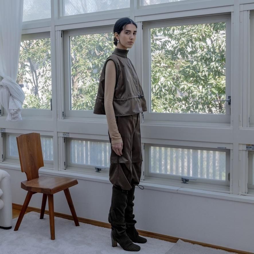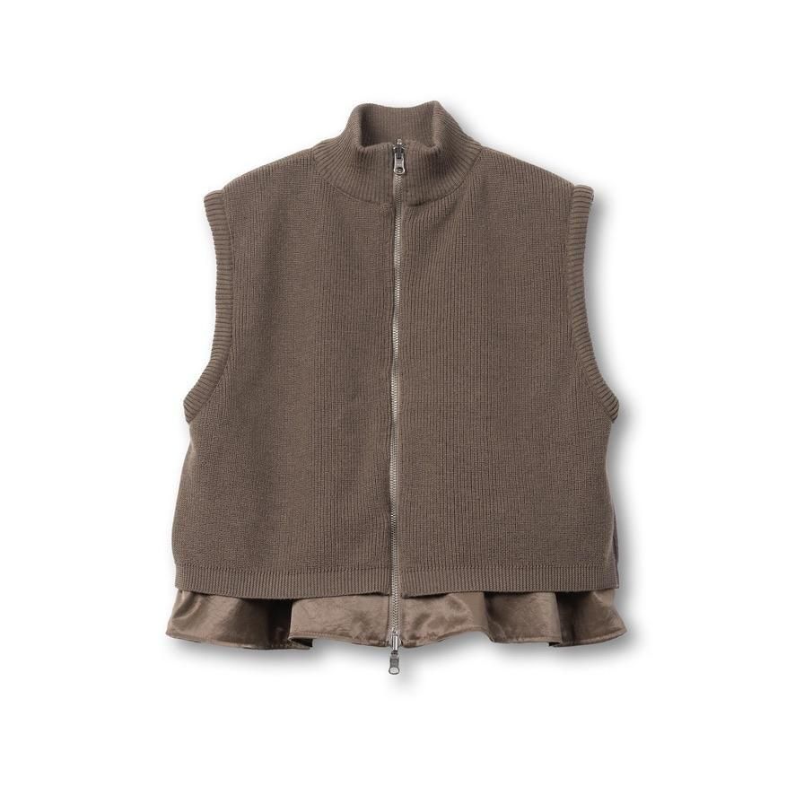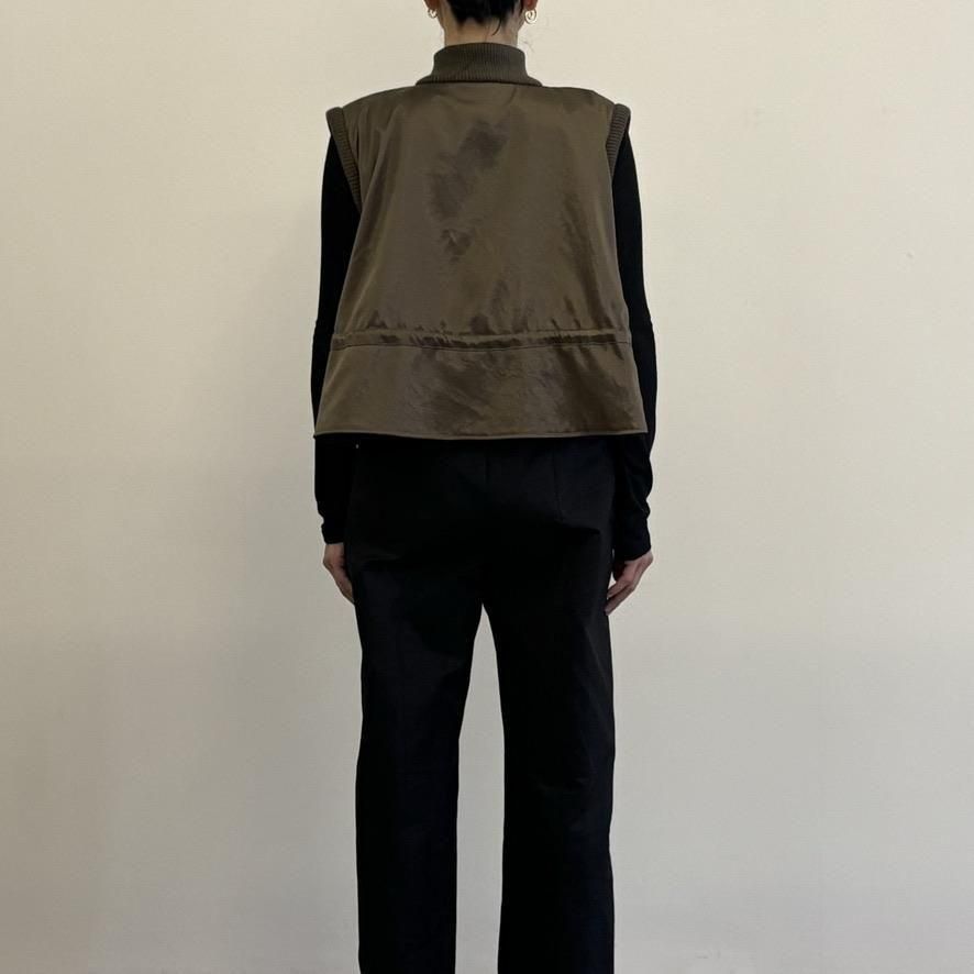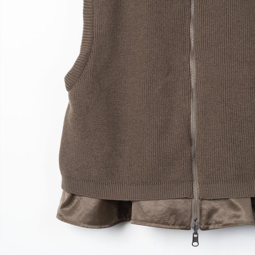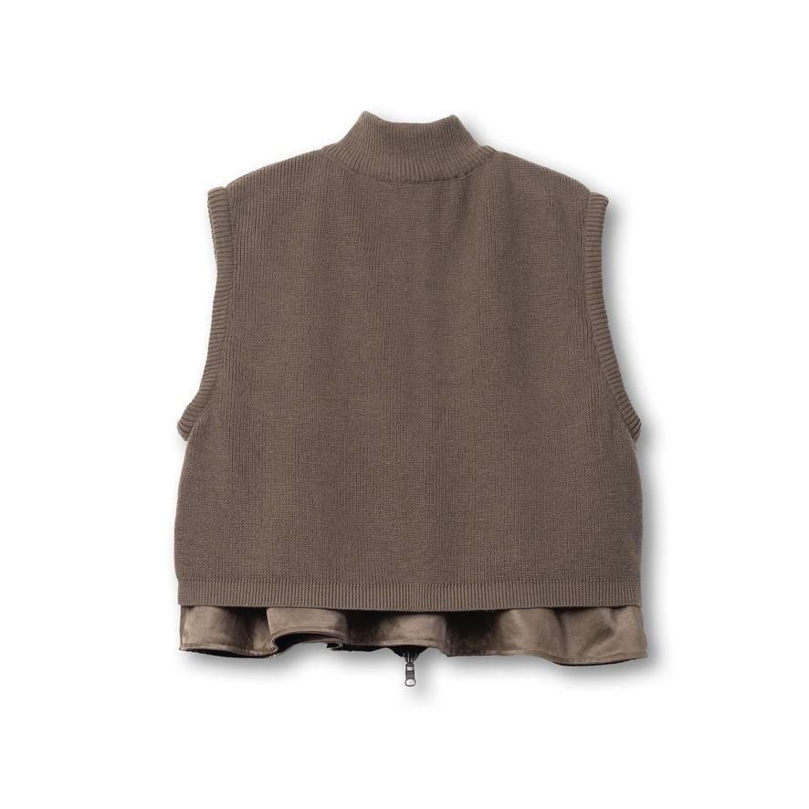 毛 48% アクリル 48% ポリエステル 4%裏地 : ポリエステル 100%MADE IN JAPANHAND WASHABLEレザーのような艶を放つサテン生地と、柔らかなリブテキスタイルのリバーシブルデザイン。逆開ファスナー仕様で、スタイリングの幅が広がるベスト。