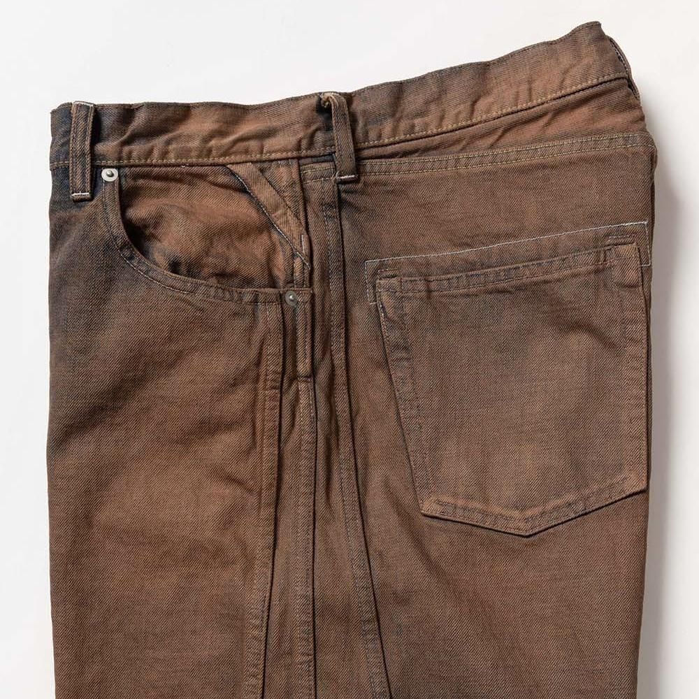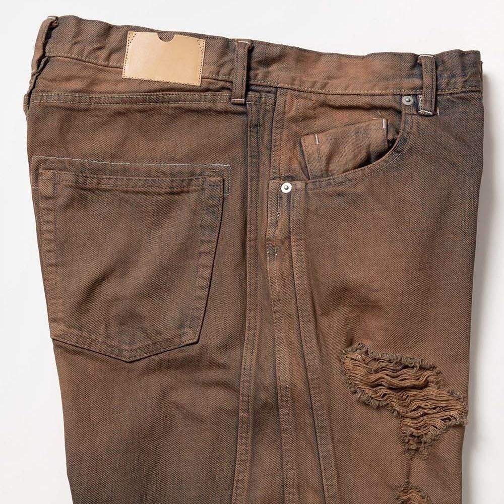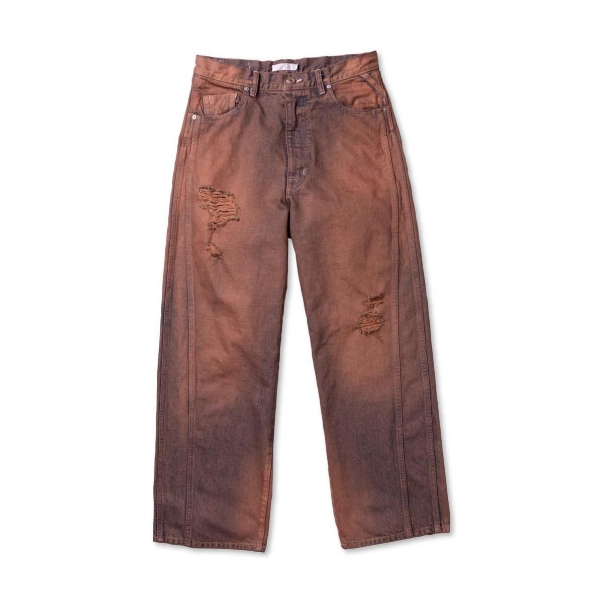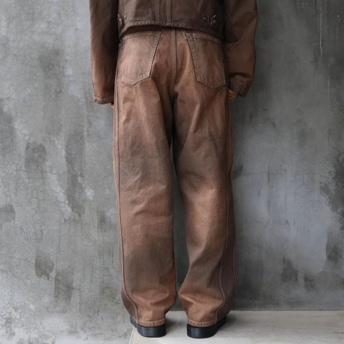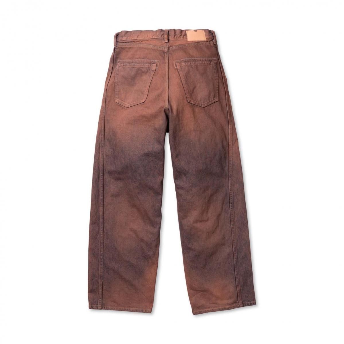 COTTON 100%MADE IN JAPANサイドシームが3本配置されたワイドシルエットの6ポケットデニム。13ozデニムを採用し、右前部にはコインポケット、左前部にはキーホルダー用ループを備え、腰部のパッチは小さなポケットにアレンジ。バックポケットには補強用テープを配し、一本のデニムに多機能なディテールを凝縮。製品洗いやダメージなど職人による手作業の加工を施しています。製品加工商品のため個体差が生じます。size 2 : W79 股上42.5 股下72.5 裾幅24.5cmmodel : 173cm 60kg 着用サイズ2