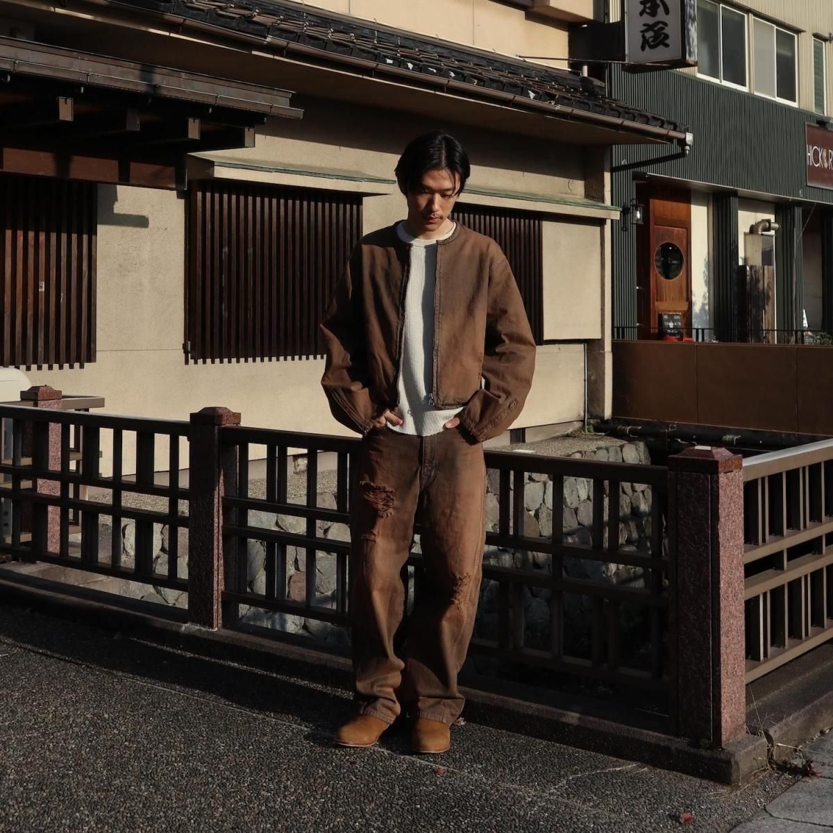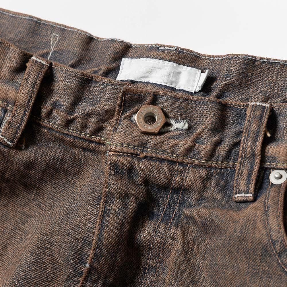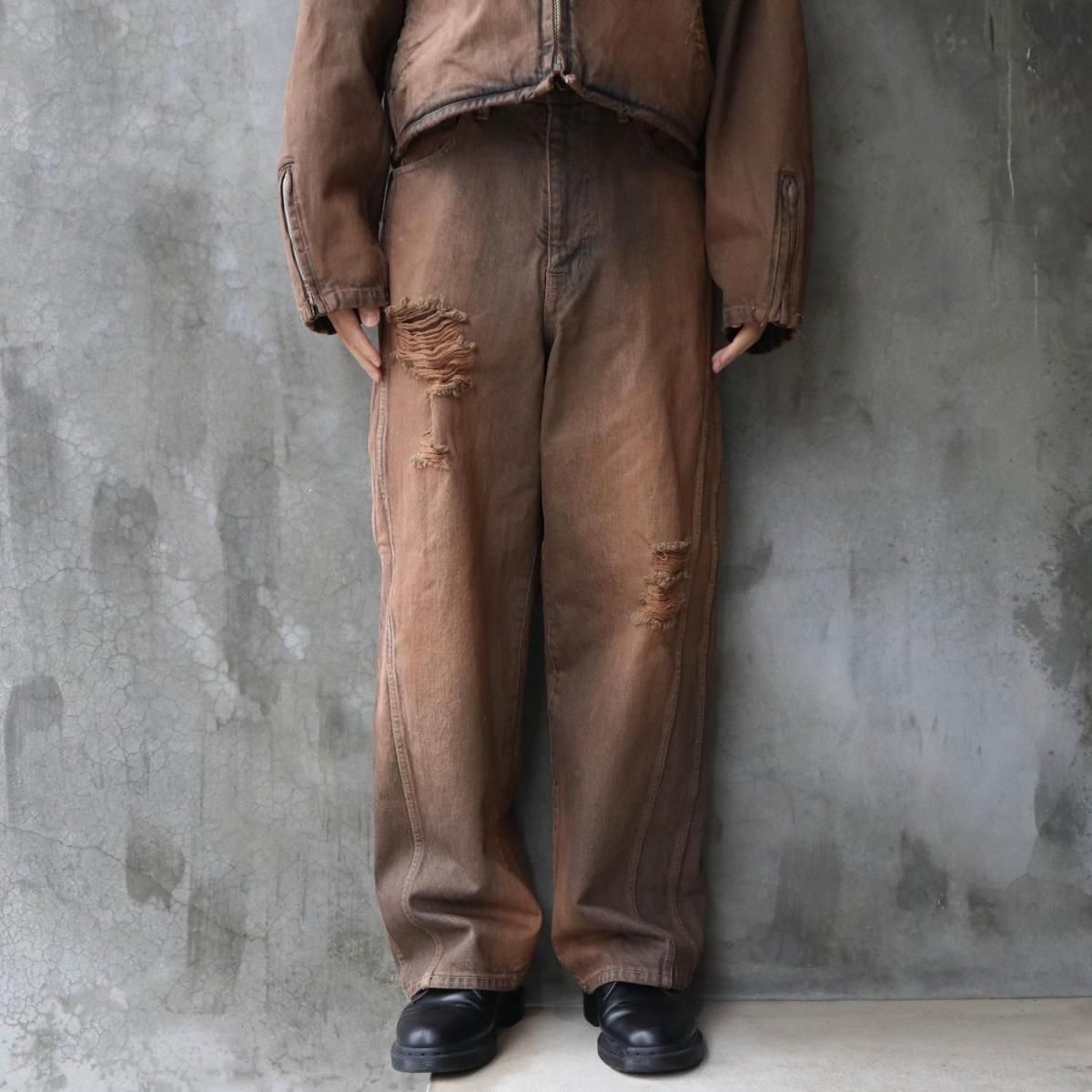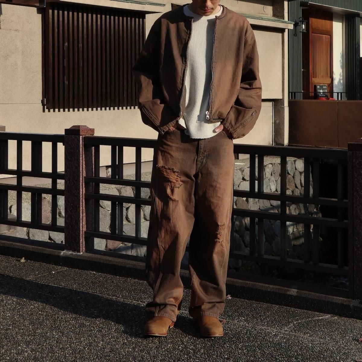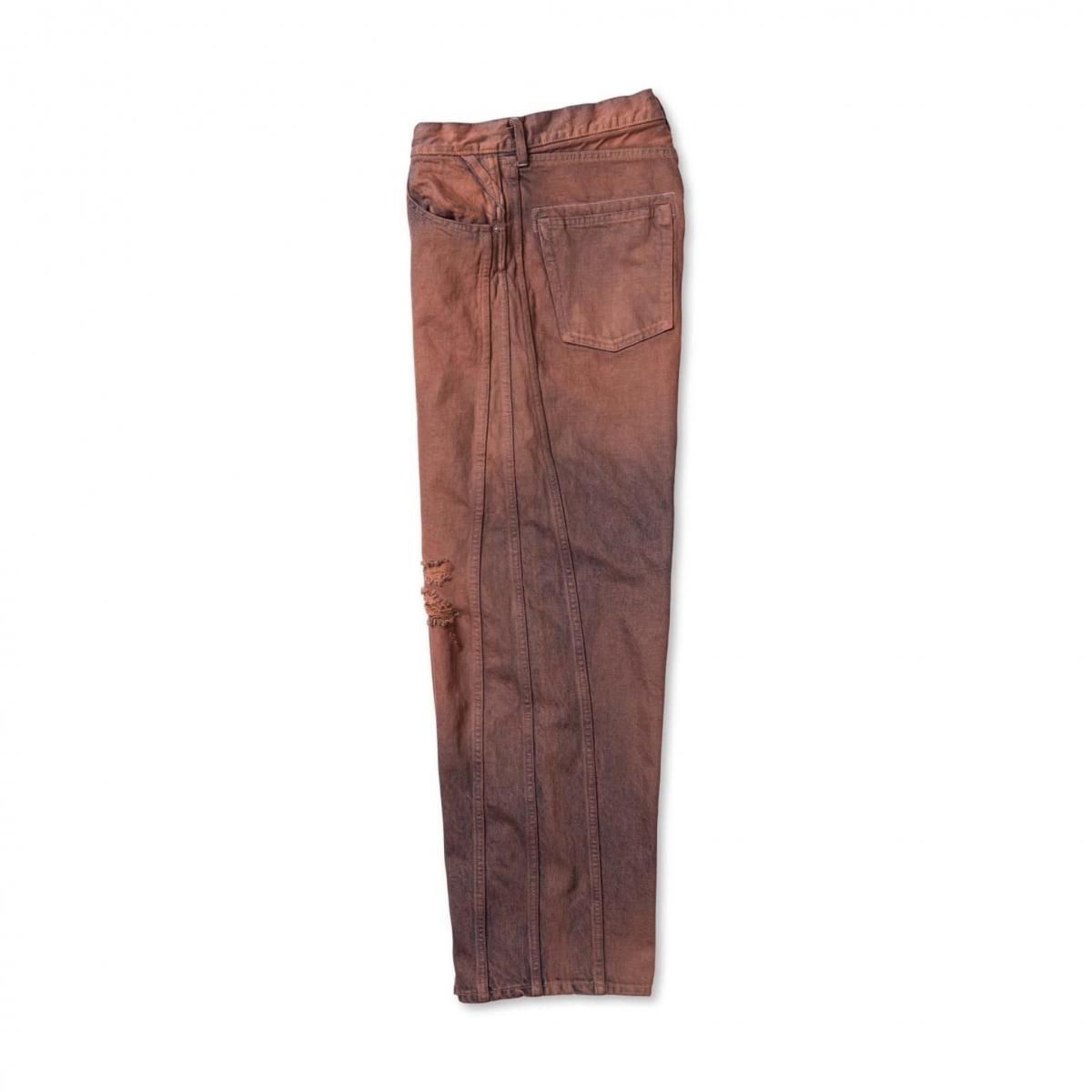 COTTON 100%MADE IN JAPANサイドシームが3本配置されたワイドシルエットの6ポケットデニム。13ozデニムを採用し、右前部にはコインポケット、左前部にはキーホルダー用ループを備え、腰部のパッチは小さなポケットにアレンジ。バックポケットには補強用テープを配し、一本のデニムに多機能なディテールを凝縮。製品洗いやダメージなど職人による手作業の加工を施しています。製品加工商品のため個体差が生じます。size 2 : W79 股上42.5 股下72.5 裾幅24.5cmmodel : 173cm 60kg 着用サイズ2