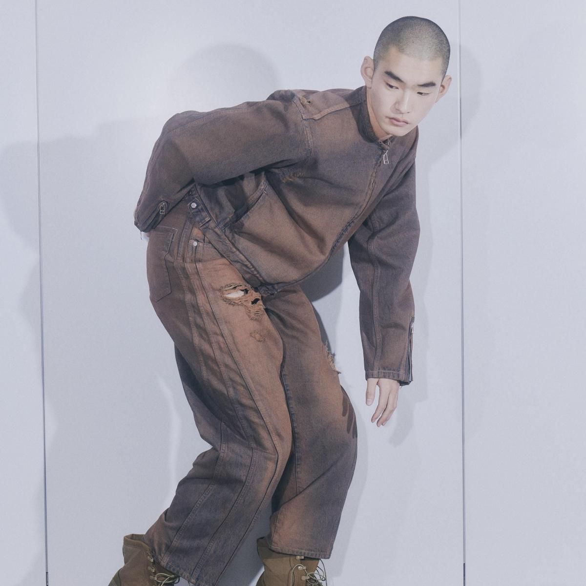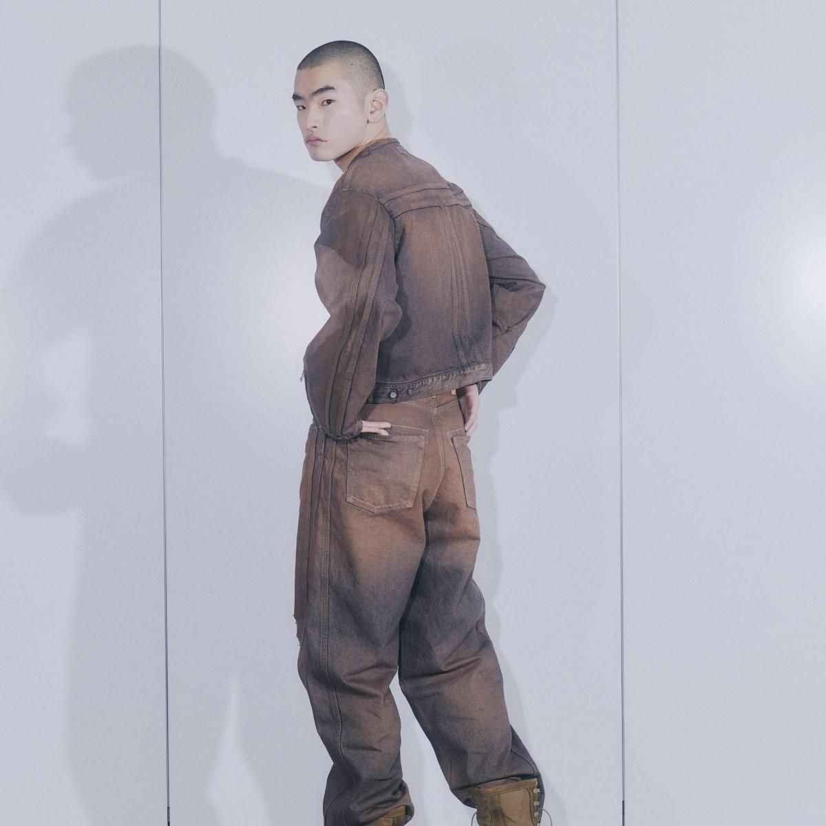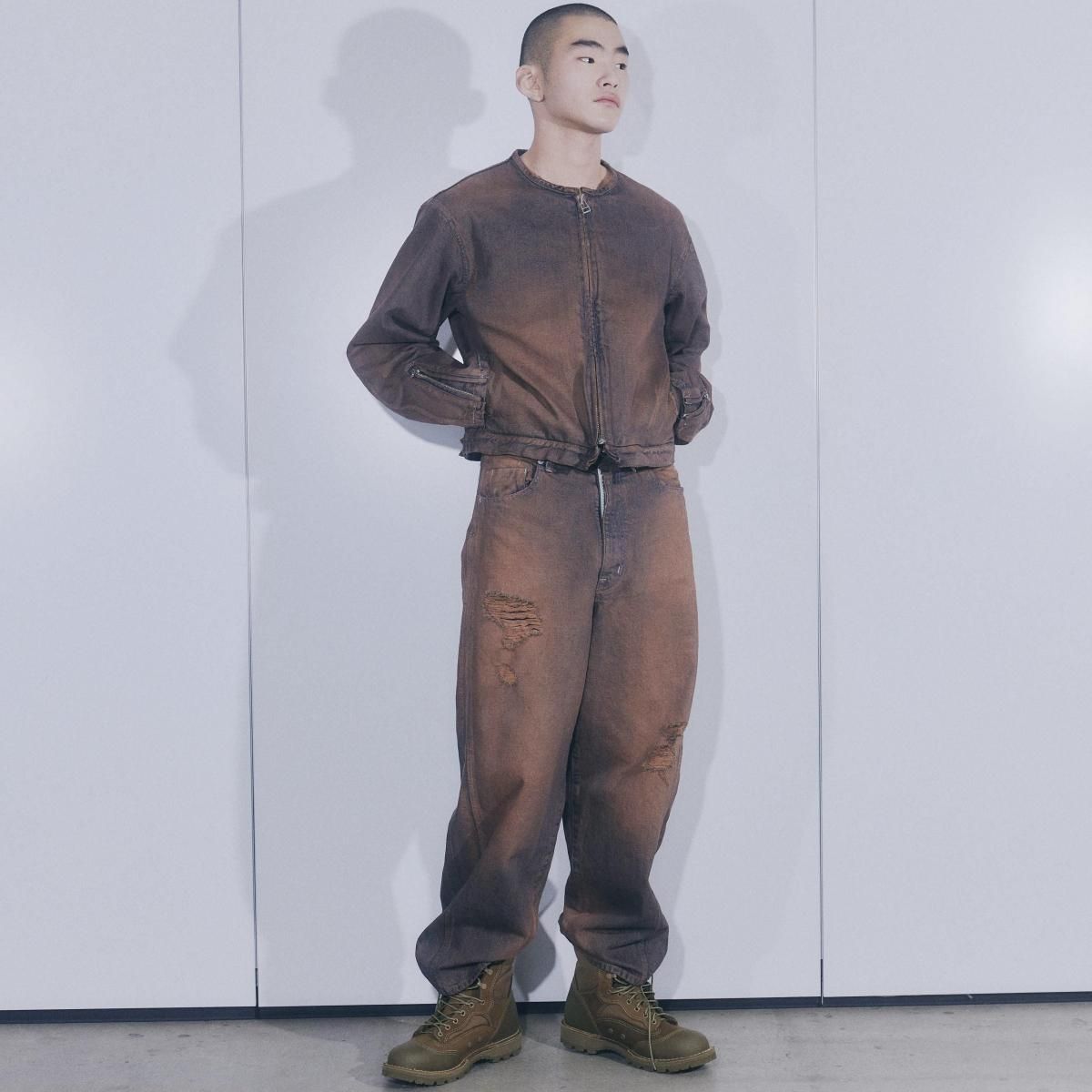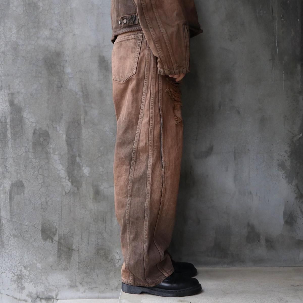 COTTON 100%MADE IN JAPANサイドシームが3本配置されたワイドシルエットの6ポケットデニム。13ozデニムを採用し、右前部にはコインポケット、左前部にはキーホルダー用ループを備え、腰部のパッチは小さなポケットにアレンジ。バックポケットには補強用テープを配し、一本のデニムに多機能なディテールを凝縮。製品洗いやダメージなど職人による手作業の加工を施しています。製品加工商品のため個体差が生じます。size 2 : W79 股上42.5 股下72.5 裾幅24.5cmmodel : 173cm 60kg 着用サイズ2