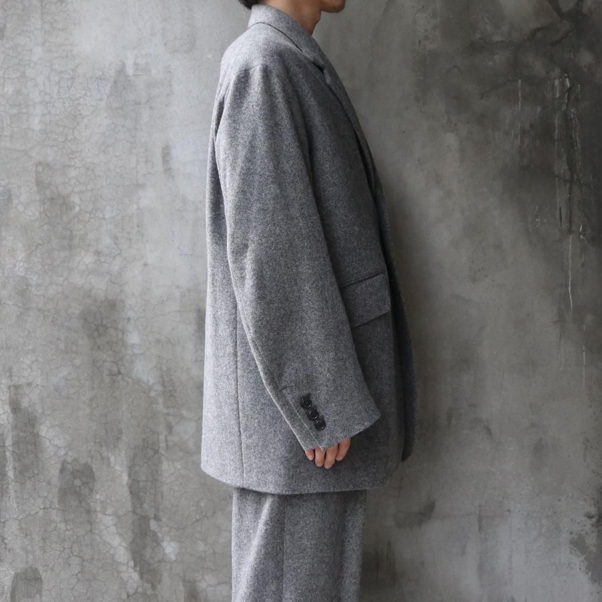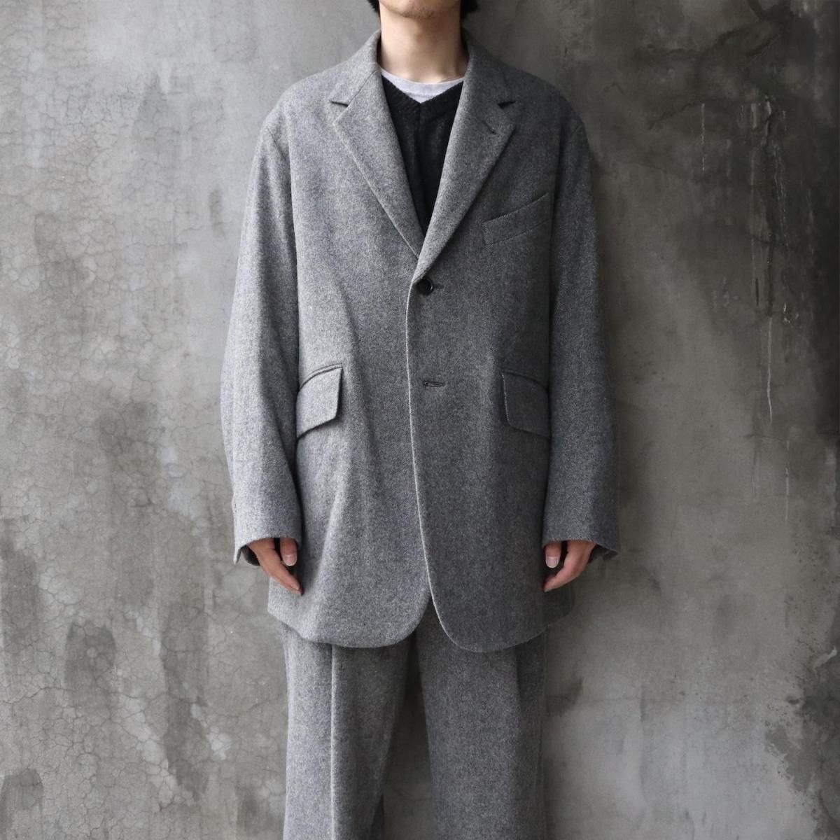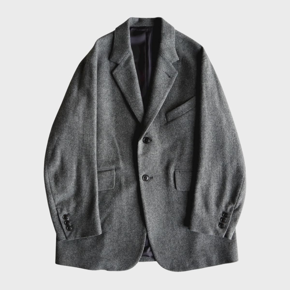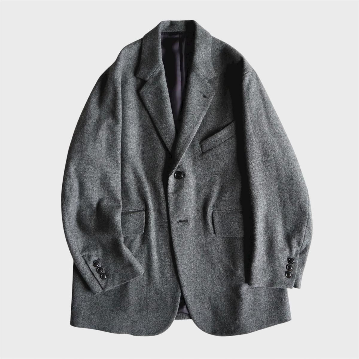ウールライトツイード素材を使用したオーバージャケット。従来のツイードよりも糸本数を減らし、さらに織密度を変えあまく織り上げたライトな質感のウール生地をオリジナルで開発。縮絨工程にも工夫をこらし、肌触りの良いツイード生地に仕上げています。2ボタン仕様、テーラードカラーは立ち襟でも着用可能。着丈をやや長めにとったオーバーシルエットになります。同素材の1タックパンツとのセットアップもお勧めです。
