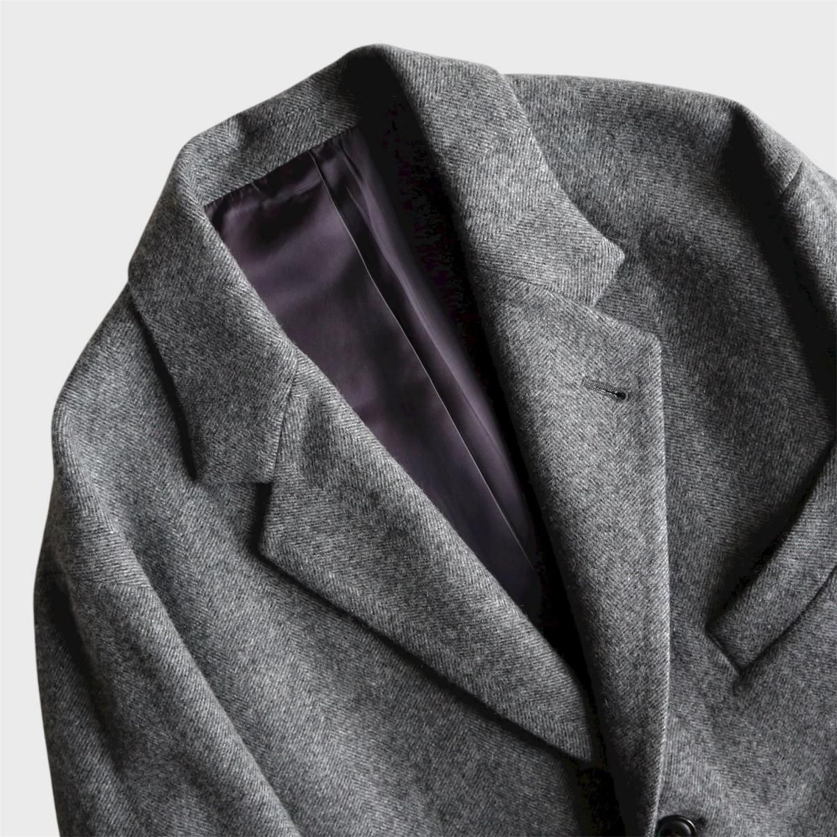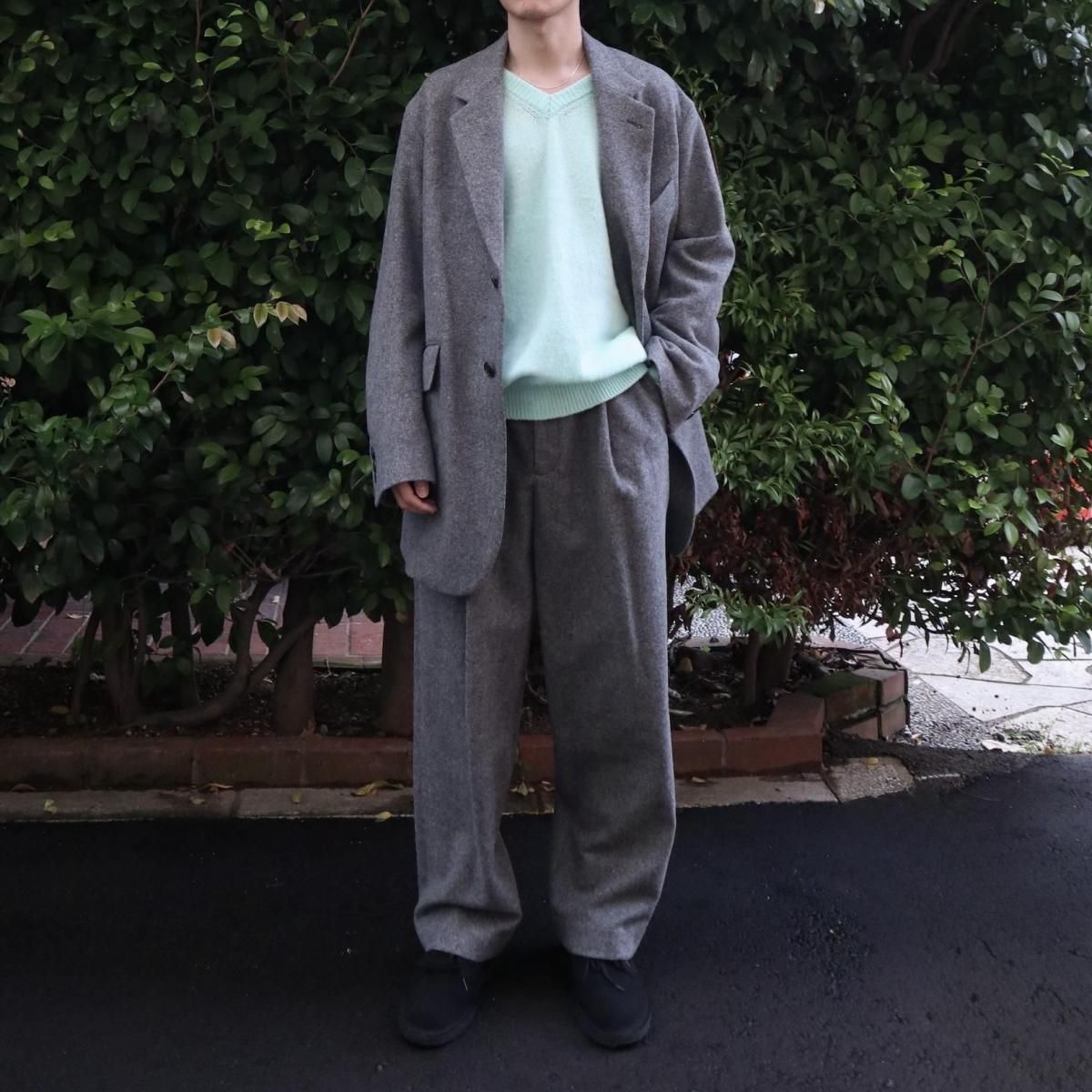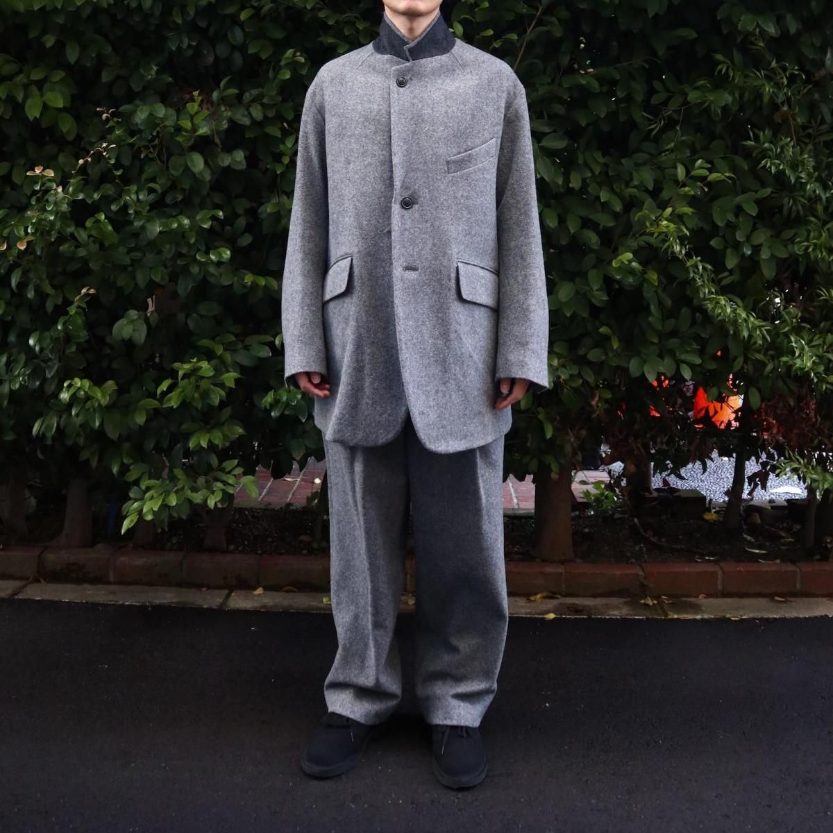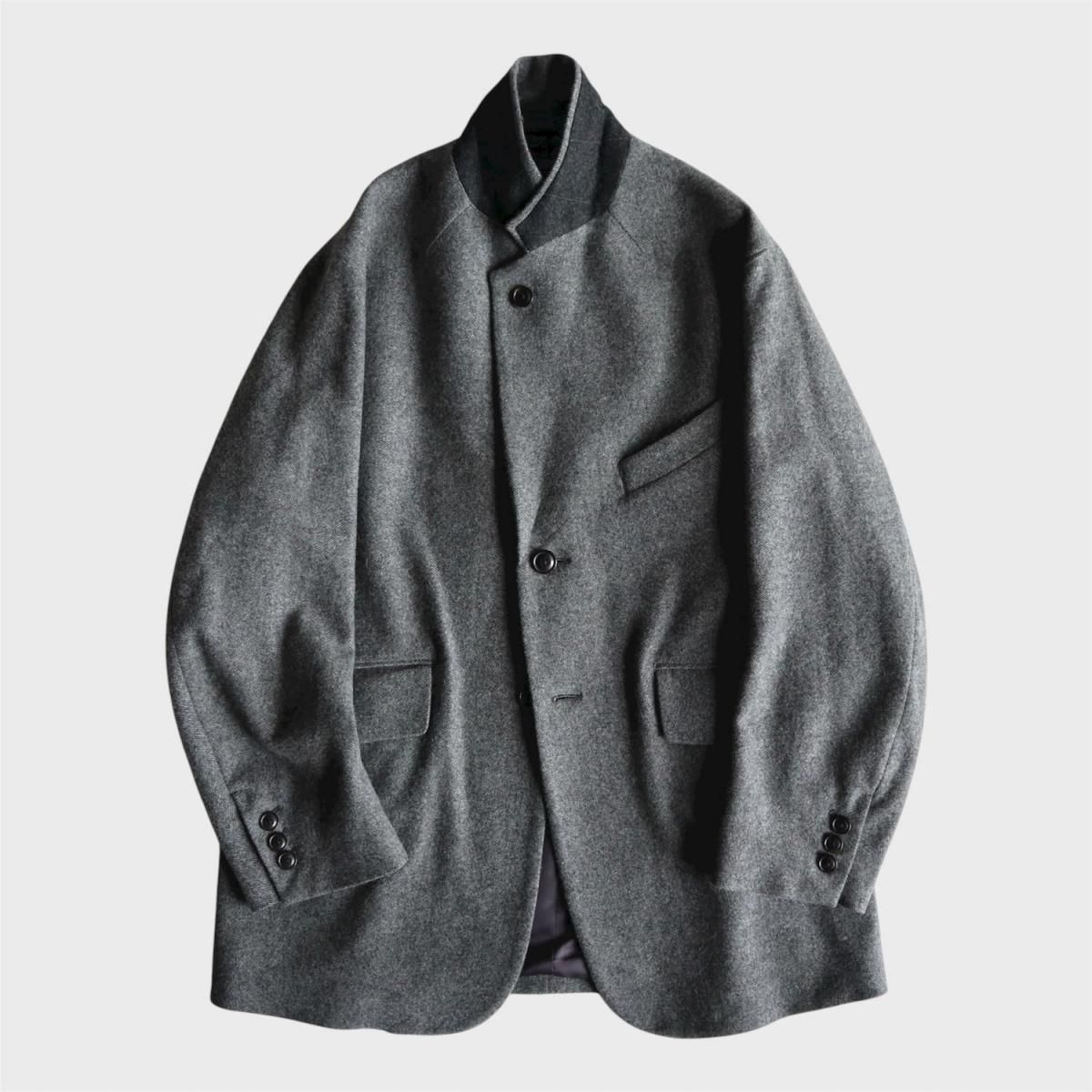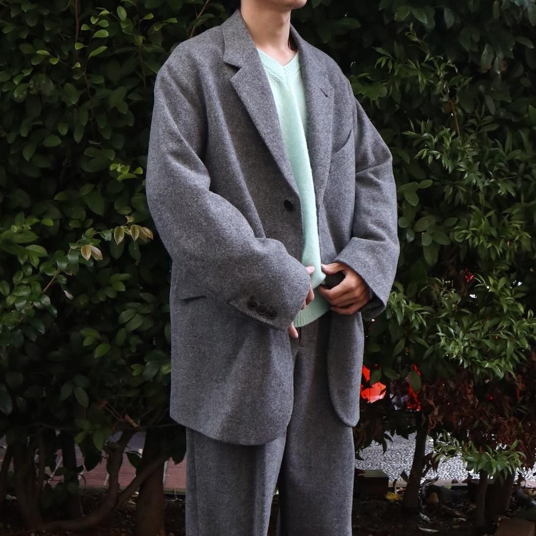 ウールライトツイード素材を使用したオーバージャケット。従来のツイードよりも糸本数を減らし、さらに織密度を変えあまく織り上げたライトな質感のウール生地をオリジナルで開発。縮絨工程にも工夫をこらし、肌触りの良いツイード生地に仕上げています。2ボタン仕様、テーラードカラーは立ち襟でも着用可能。着丈をやや長めにとったオーバーシルエットになります。同素材の1タックパンツとのセットアップもお勧めです。