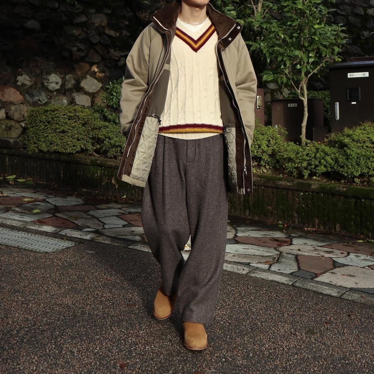 FRONT : WOOL 80% NYLON 16% OTHER 4%LINING : CUPRA 100%FABRIC : WOOL LIGHT TWEEDウールライトツイード素材を使用した1タックパンツ。従来のツイードよりも糸本数を減らし、さらに織密度を変えあまく織り上げたライトな質感のウール生地をオリジナルで開発。縮絨工程にも工夫をこらし、肌触りの良いツイード生地に仕上げています。深くとったフロントのタックと、テーパードを効かせたシルエットが特徴で、カジュアルにもドレスにも対応できる汎用性の高さが魅力な1本。size 2 : W86 股上40 股下72 裾幅23cmmodel : 173cm 60kg 着用サイズ2