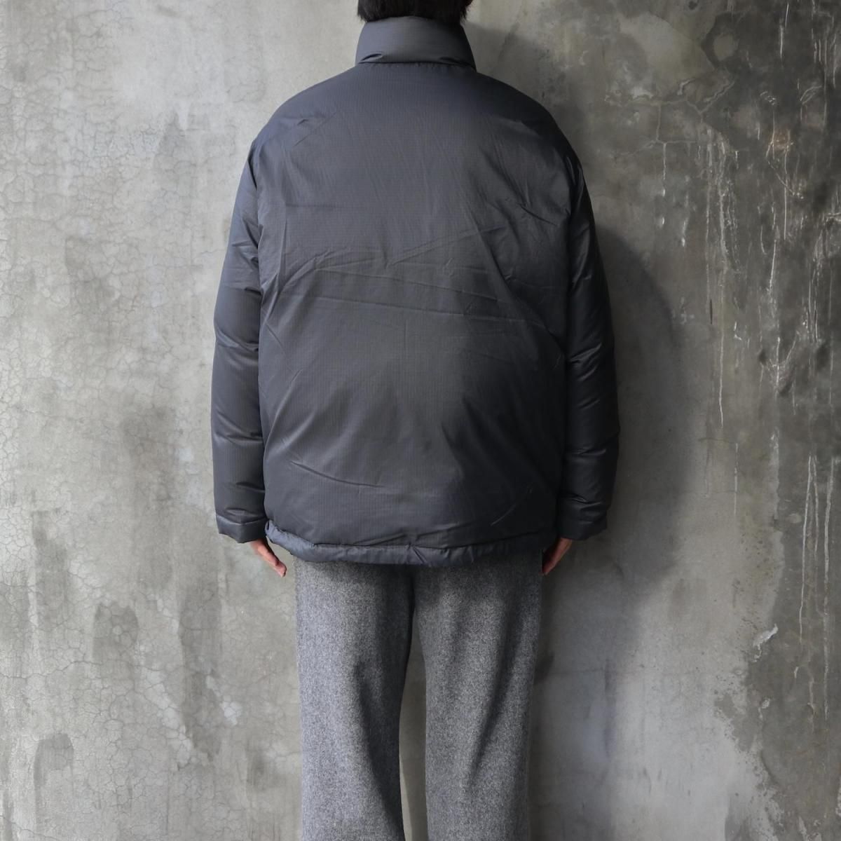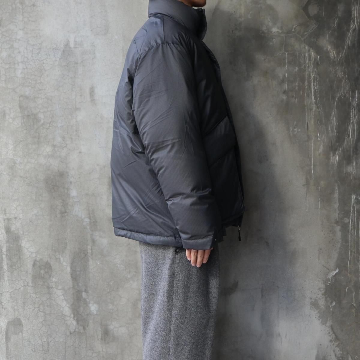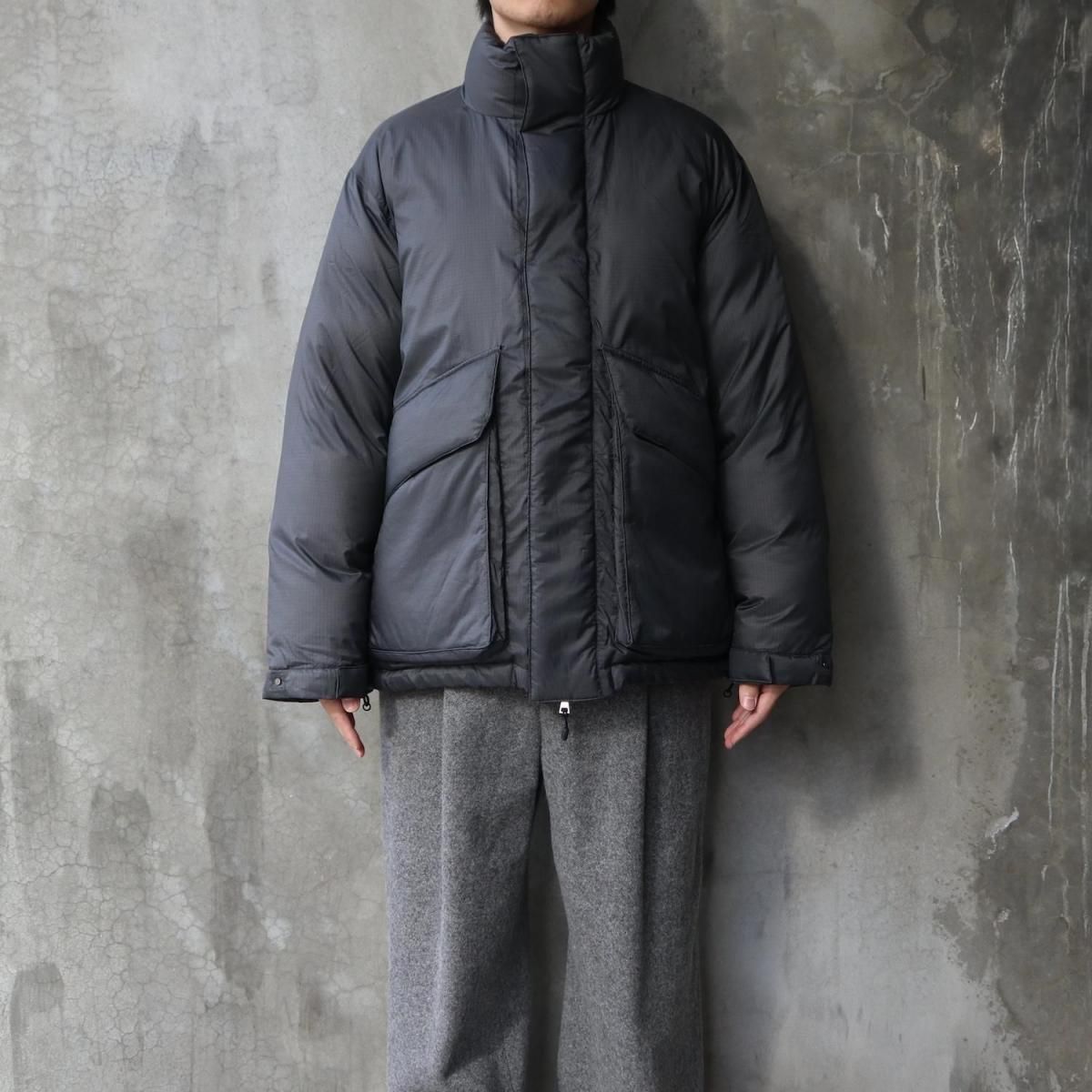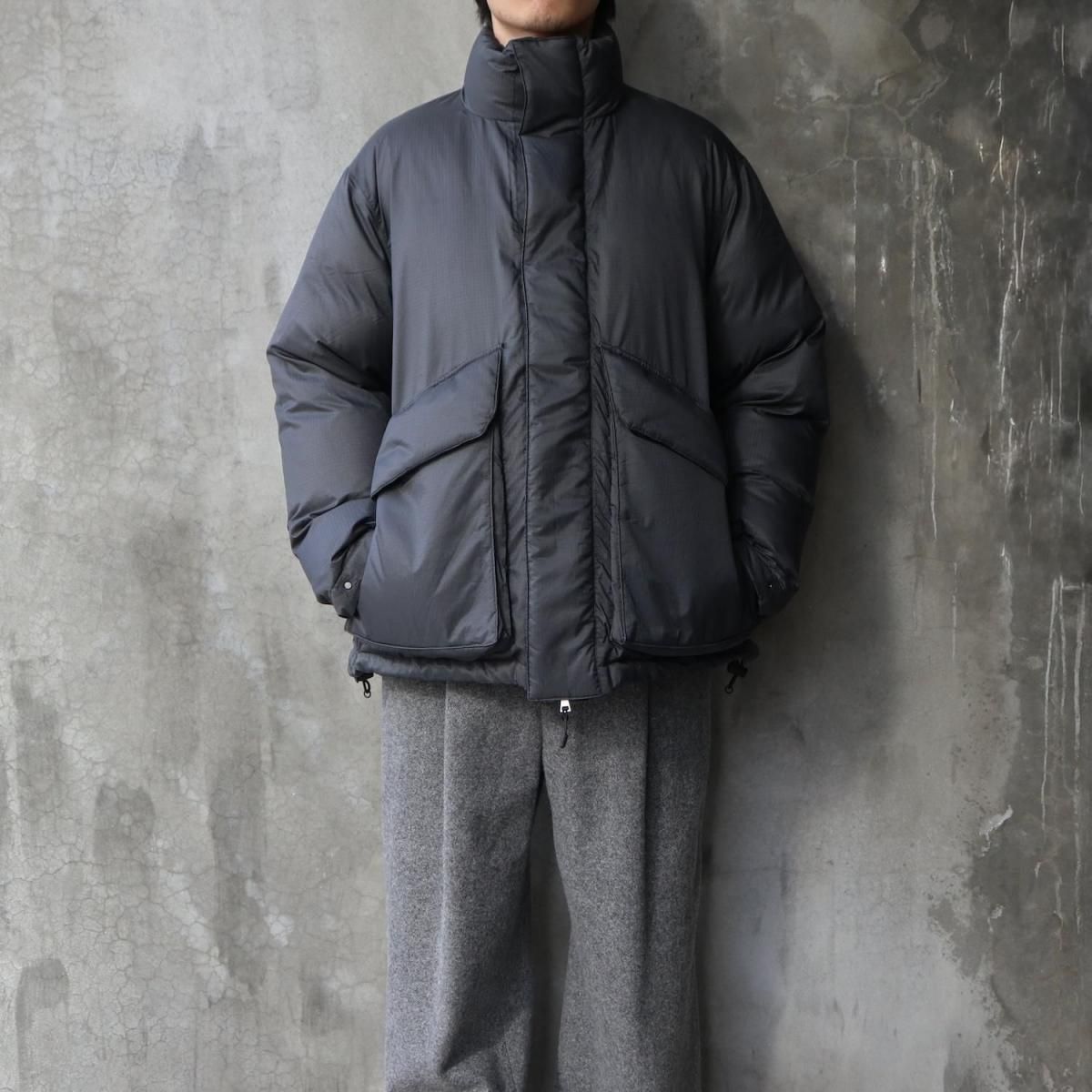FRONT : NYLON 100%LINING : NYLON 100%PADDING : DOWN 90% FEATHER 10%FABRIC : NYLON DOWNナイロンリップストップ素材を使用したダウンジャケット。やや繊細なタッチのナイロン素材を使用し、着心地はもちろん見た目の印象も軽快に仕上げています。表面にダウン止ステッチを見せないスッキリと洗練された雰囲気に仕上げたのもこのジャケットの特徴の一つ。やや大きめに設定したフラップ付きのフロントポケットは、収納力とデザインのアクセントに。さらに保温性に優れた特殊素材を内側に貼ったハンドウォーマーポケットも完備。アームホールにダーツを入れ、背中に丸みを作るパターン操作はURUならでは。シンプルなデザインながら随所に拘り抜かれたダウンジャケットです。size 2 : 着丈71 身幅68 肩幅51 袖丈58cmmodel : 173cm 60kg 着用サイズ2