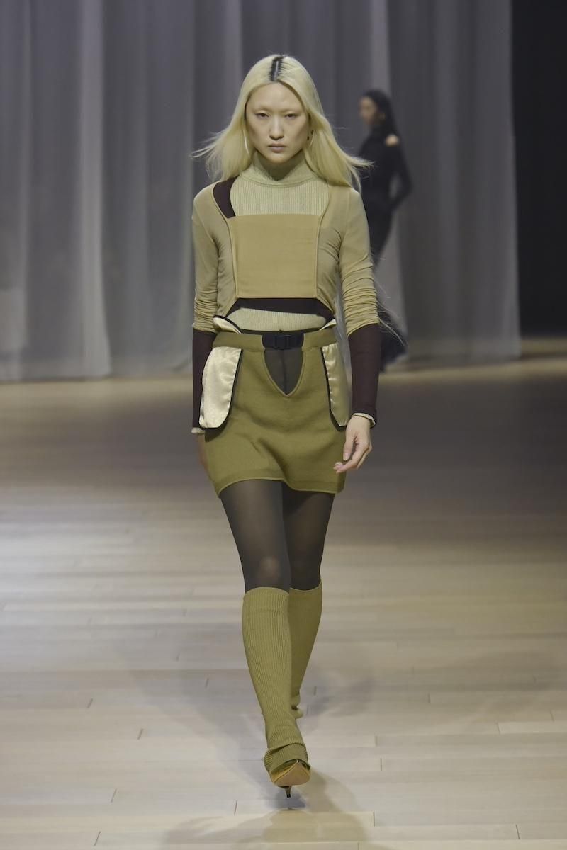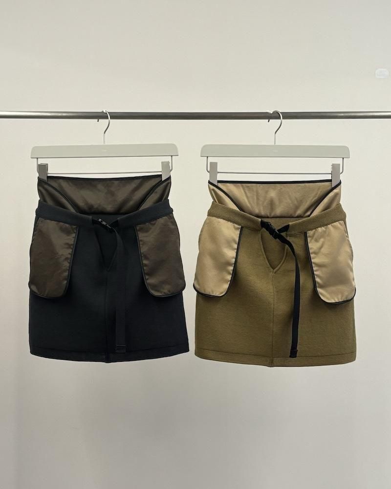 TAN / V-FRONT KNIT LAYERED MINI SKIRT