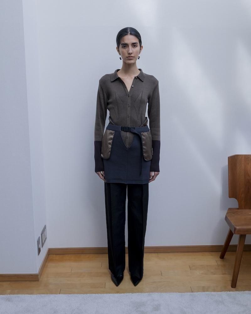 30%OFFCOTTON 80% CASHMER 20%配色部分 POLYESTER 100%MADE IN JAPAN フロントをくり抜いたVラインが特徴的なミニマルデザインのミニスカート。他のボトムスとのレイヤードも楽しめます。丈38 裾幅46 WフリーHAND WASHABLE